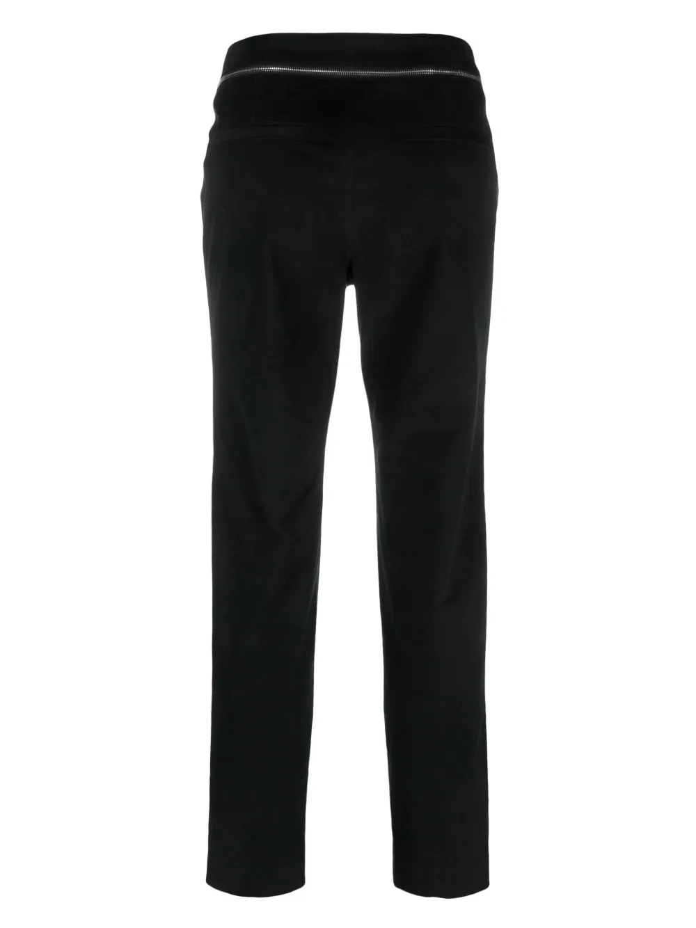 Серебристая фурнитура, деталь с молнией, низкая посадка, застежка на кнопки и молнию спереди, передние карманы на молнии и два кармана с листочкой сзади.