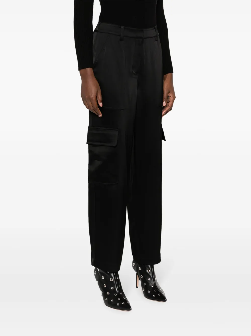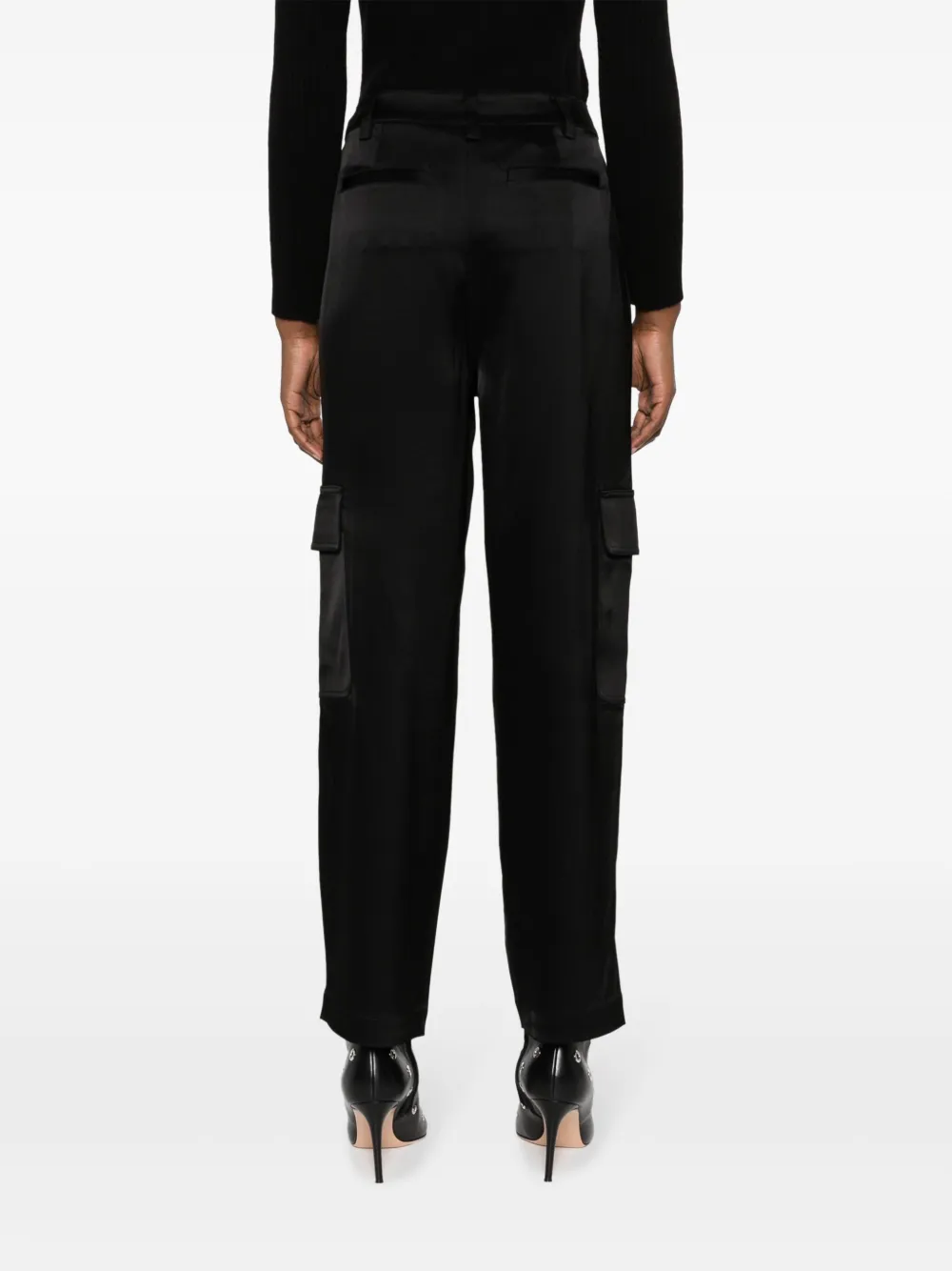 Черный, сатиновая фактура, завышенная талия, петли для ремня, зауженный крой, два кармана с клапанами по бокам, два прорезных кармана по бокам, два кармана с листочкой сзади и прямой подол.