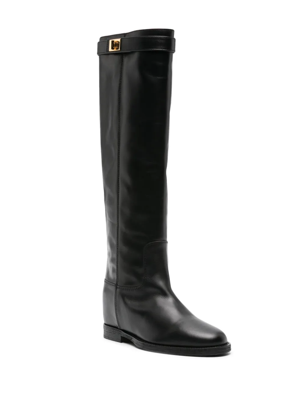 Длина по колено, боковые застежки с пряжками, закругленный носок, стелька с логотипом и плоская резиновая подошва.