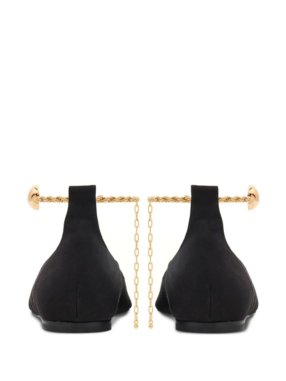 Черный, козья кожа, золотистая фурнитура, канатная цепь, заостренный носок, застежка-карабин, кожаная стелька с логотипом и плоская кожаная подошва.