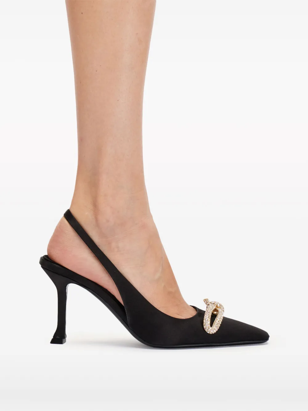Черный, матовый эффект, бант, декор из кристаллов, заостренный носок, эластичный ремешок на пятке, кожаная стелька с логотипом, высокий скульптурный каблук и кожаная подошва.
