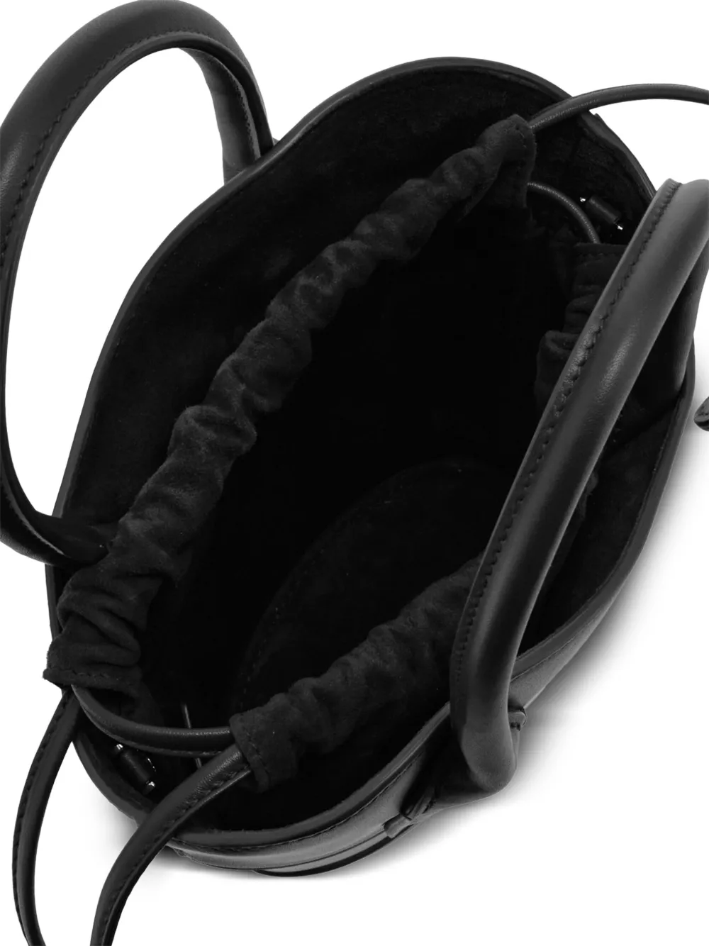 Черный, кожа, козья кожа, вырезные детали, логотип спереди, две закругленные верхние ручки, съемный регулируемый ремень на плечо, кулиска и основное отделение.