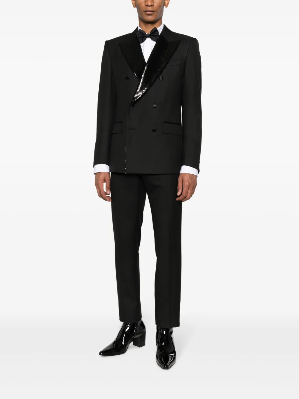 Черный, заостренные лацканы, пайетки, двубортная застежка на кнопки, прорезной карман на груди, два передних кармана с клапанами, длинные рукава и прямой подол.