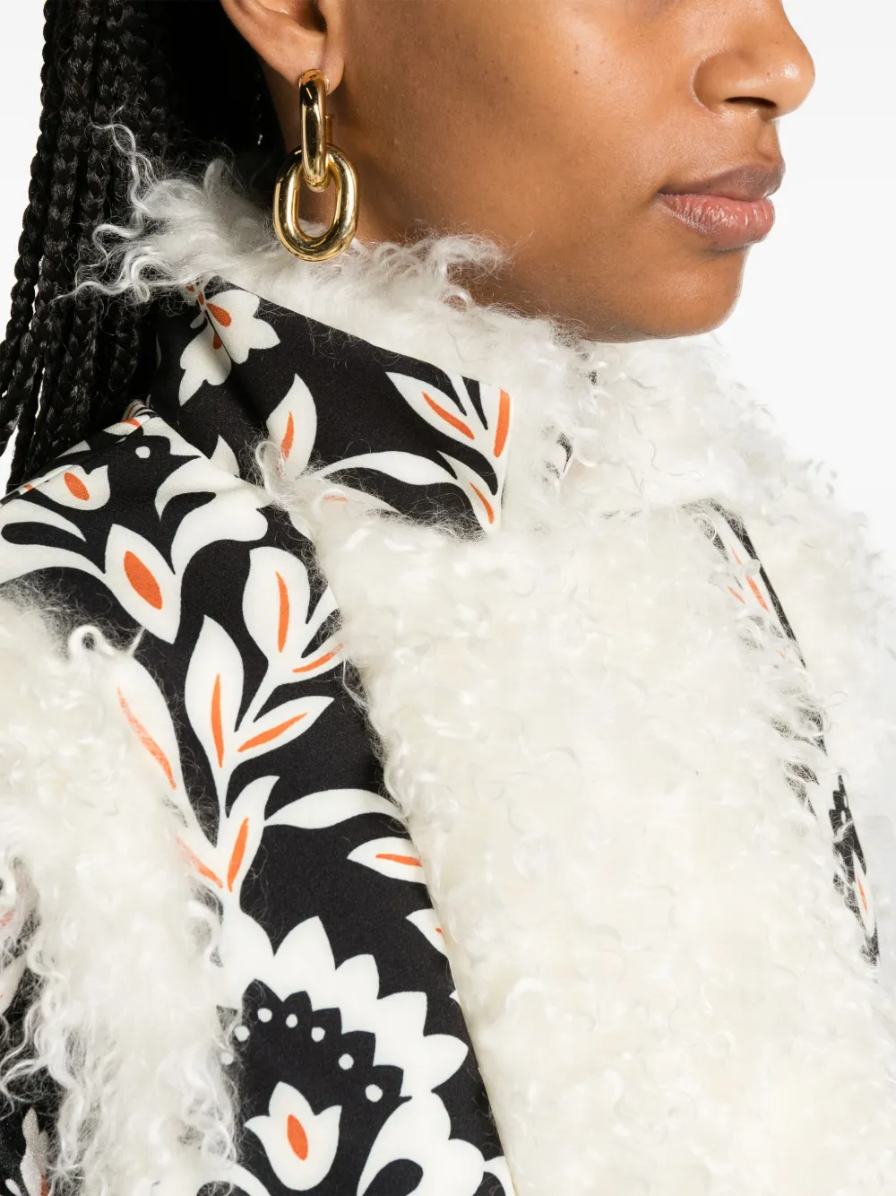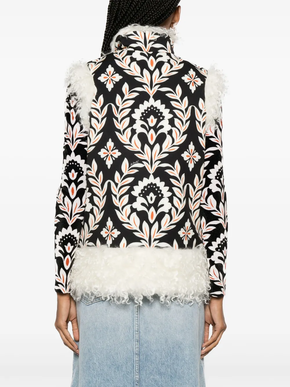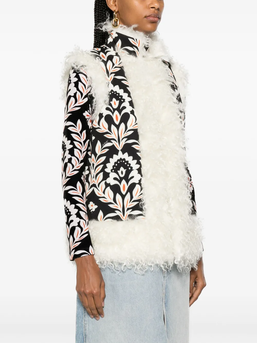 Белый/черный, отделка из искусственной овчины, цветочный принт, воротник-стойка, застежка на крючок, без рукавов и прямой подол.