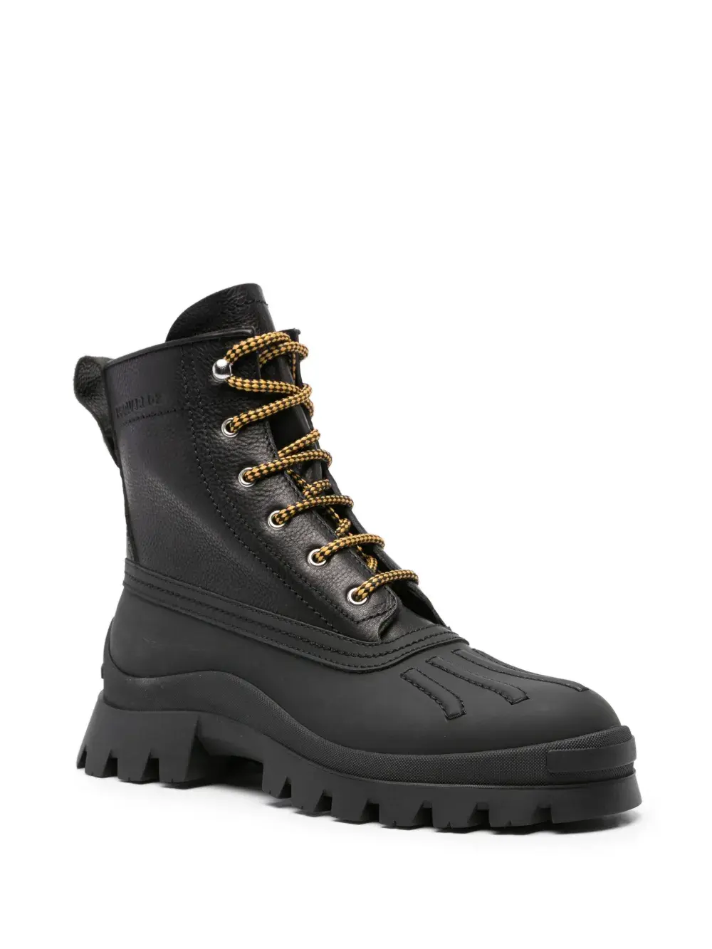 Черный, телячья кожа, закругленный носок, тисненый логотип сбоку, петля для подтягивания сзади, шнуровка спереди, лиф со вставками и массивная резиновая подошва.