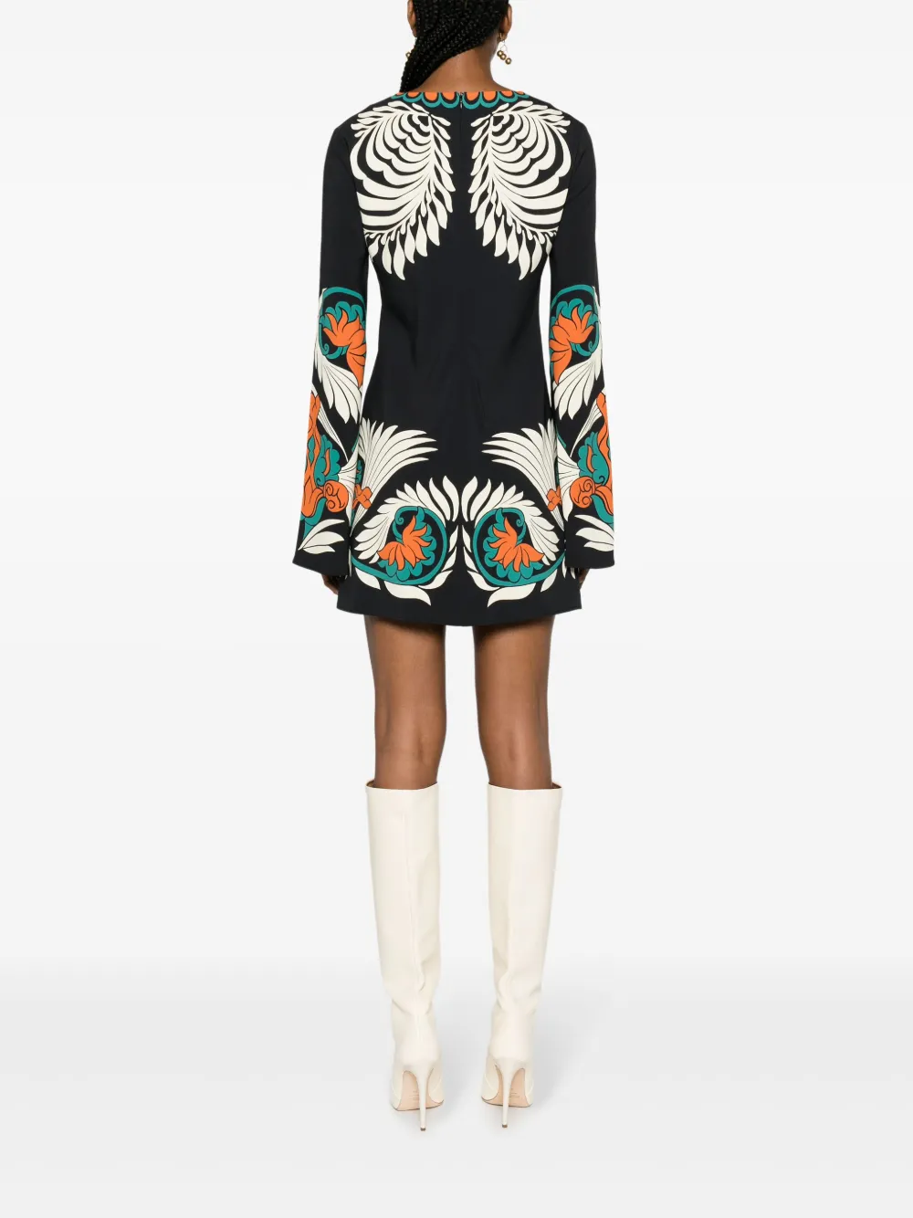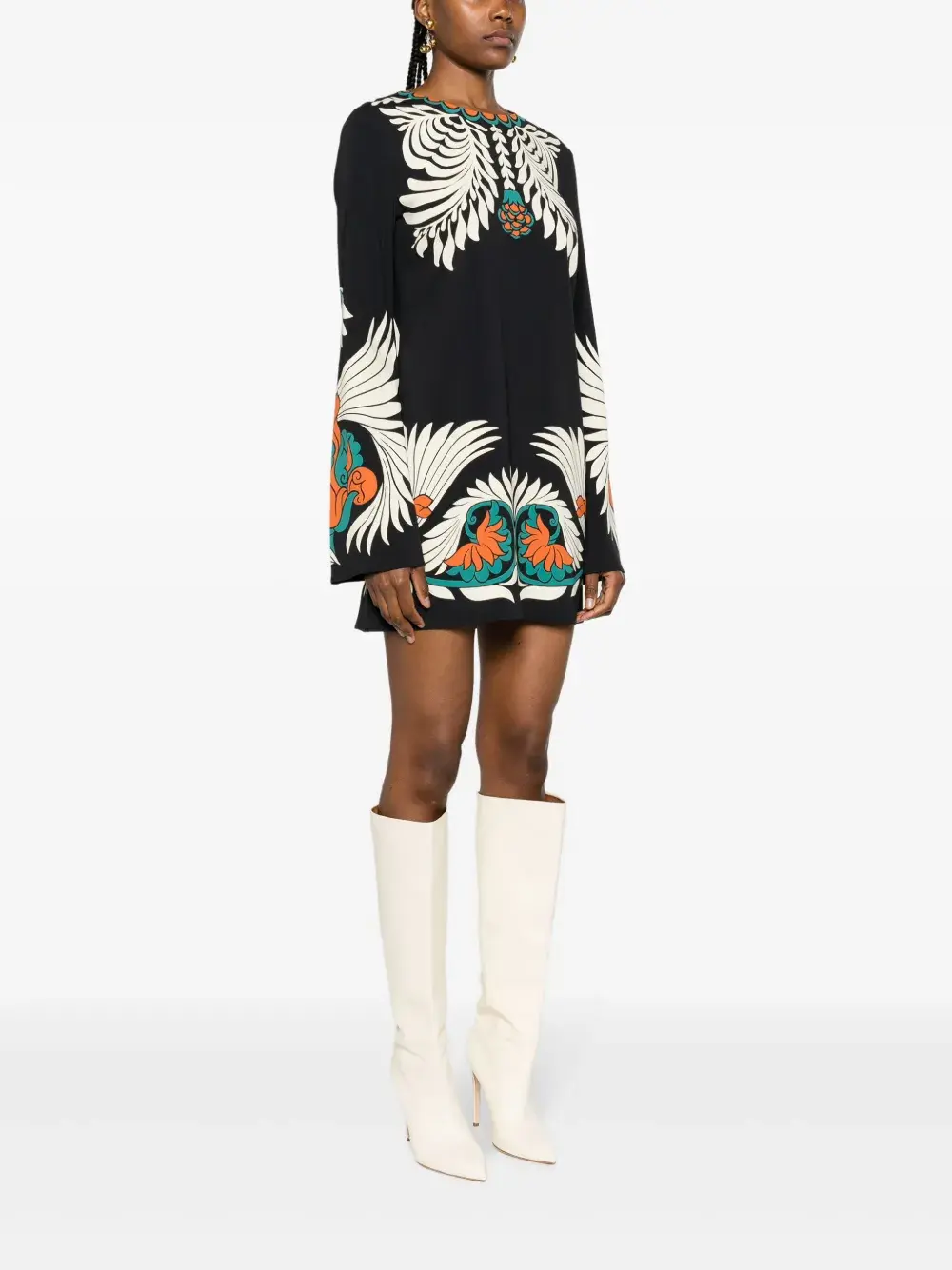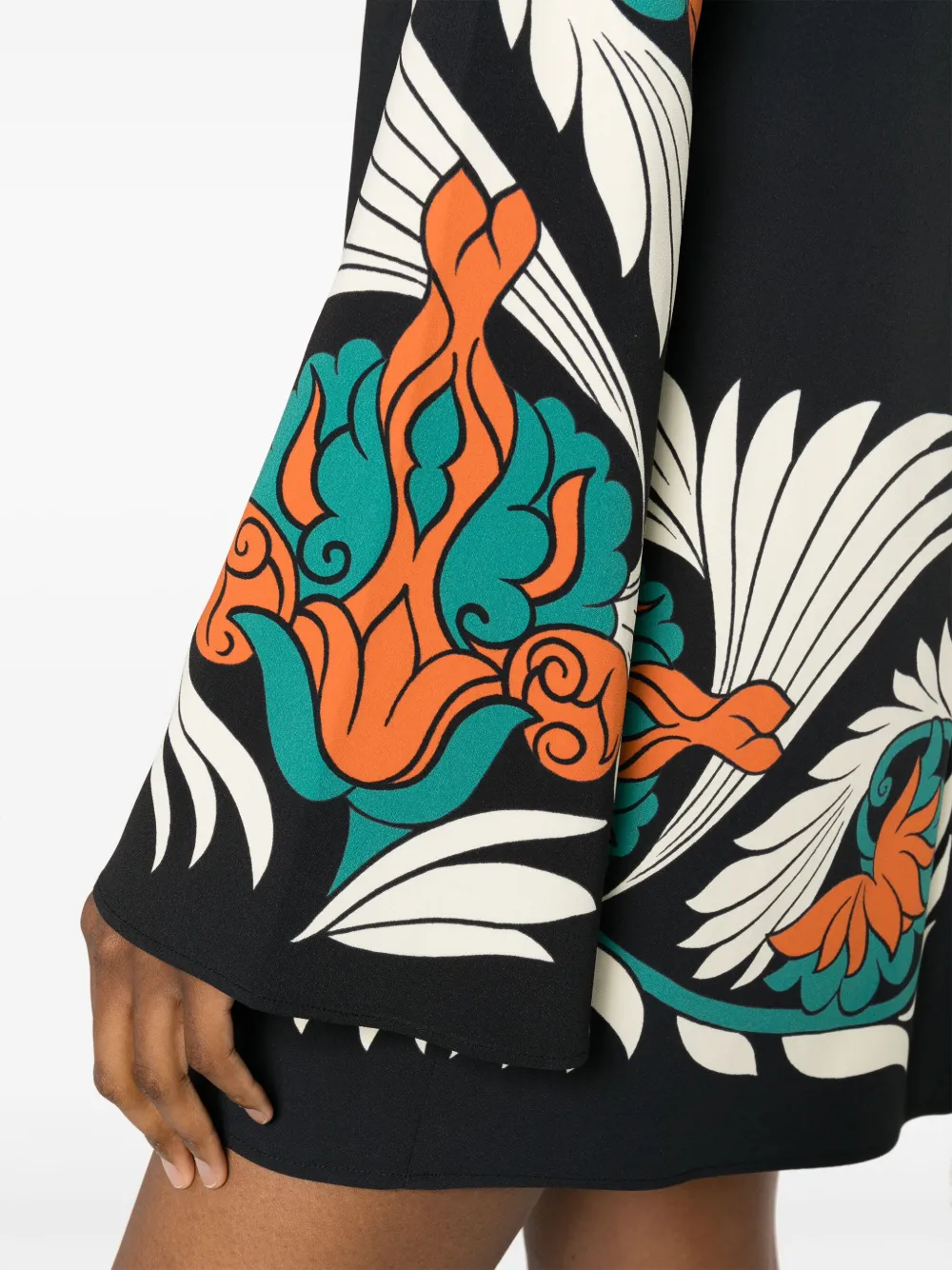 Черный/разноцветный, эластичный материал, сплошной графичный принт, круглый вырез, длинные рукава, потайная застежка на молнии сзади, длина до бедер и прямой подол.