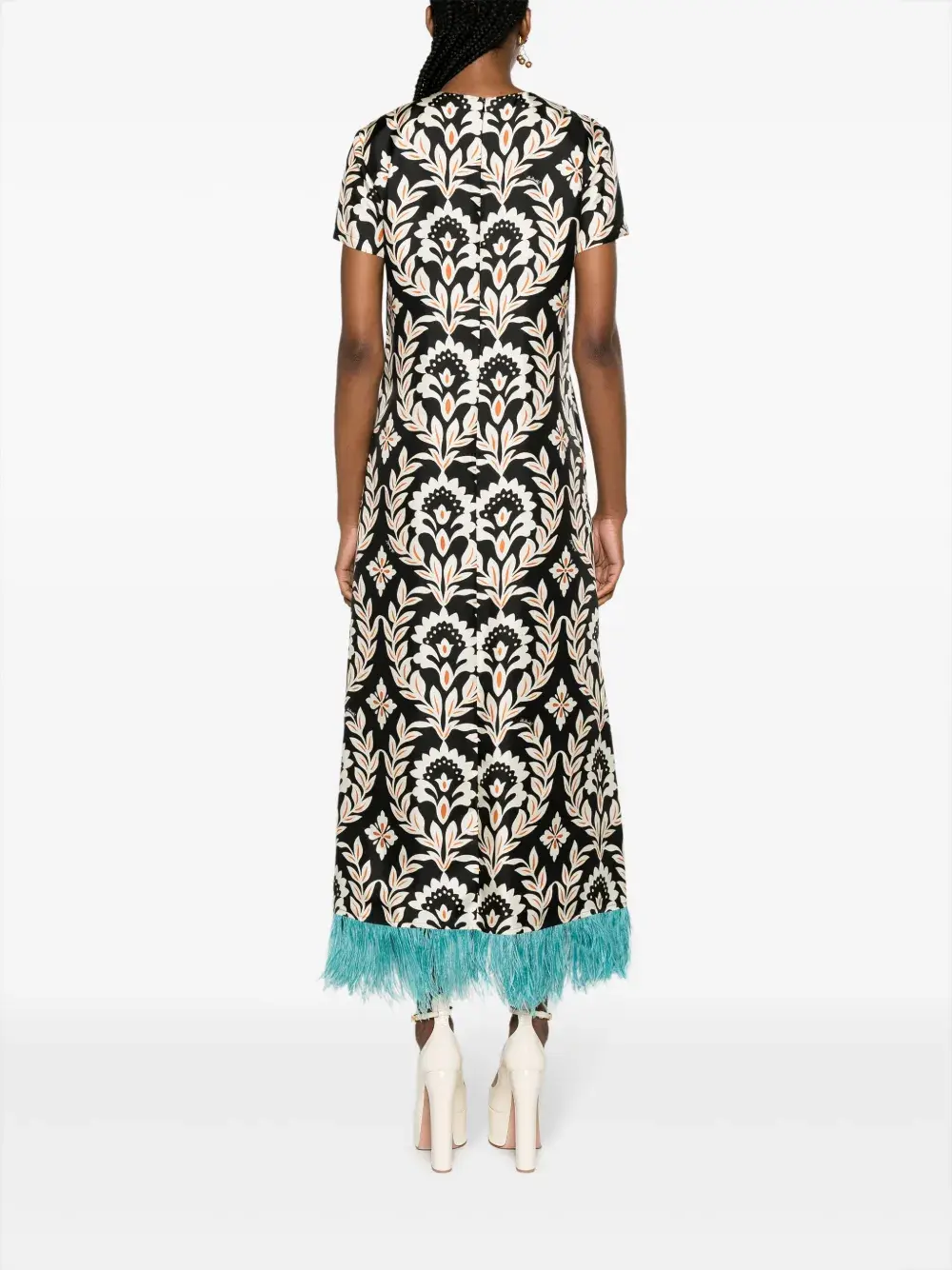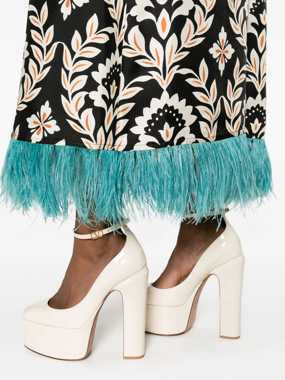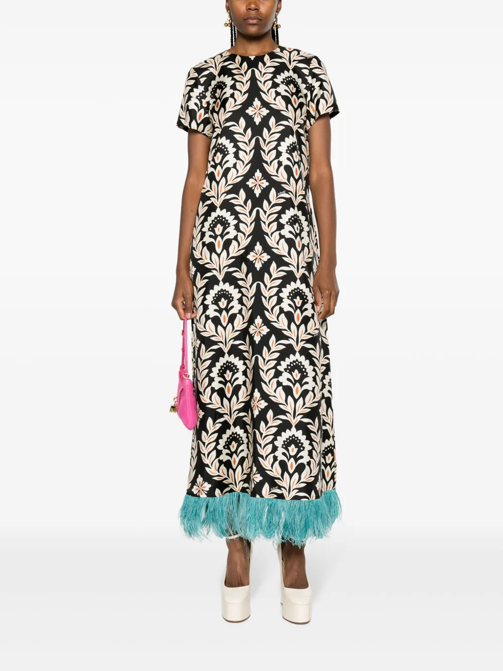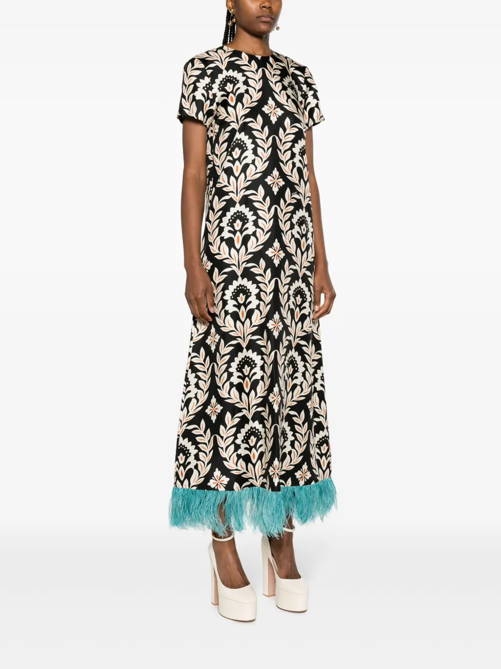 Черный/разноцветный, смесовый шелк, цветочный принт, отделка перьями, круглый вырез, короткие рукава, силуэт трапеция и высота по щиколотку.