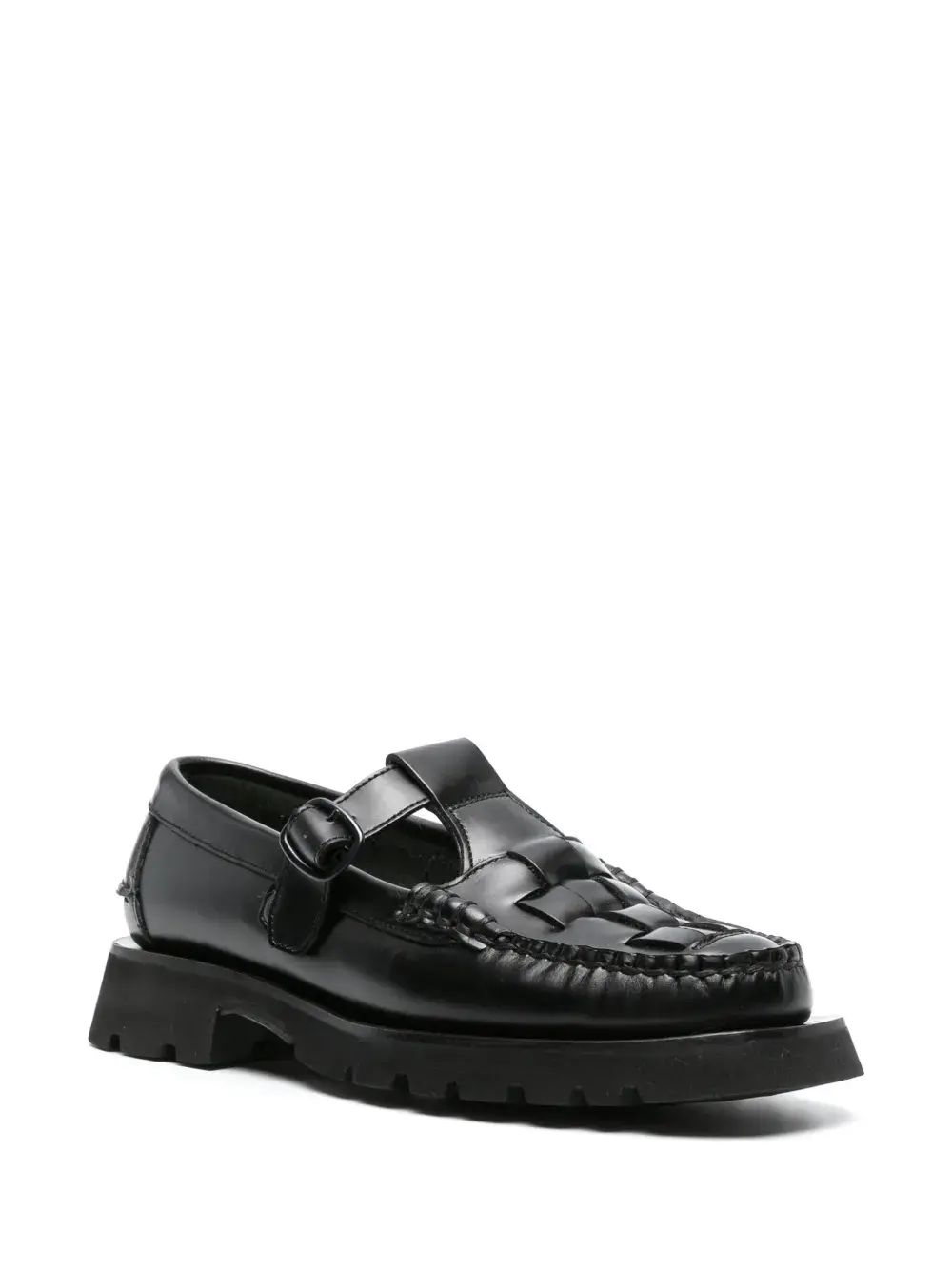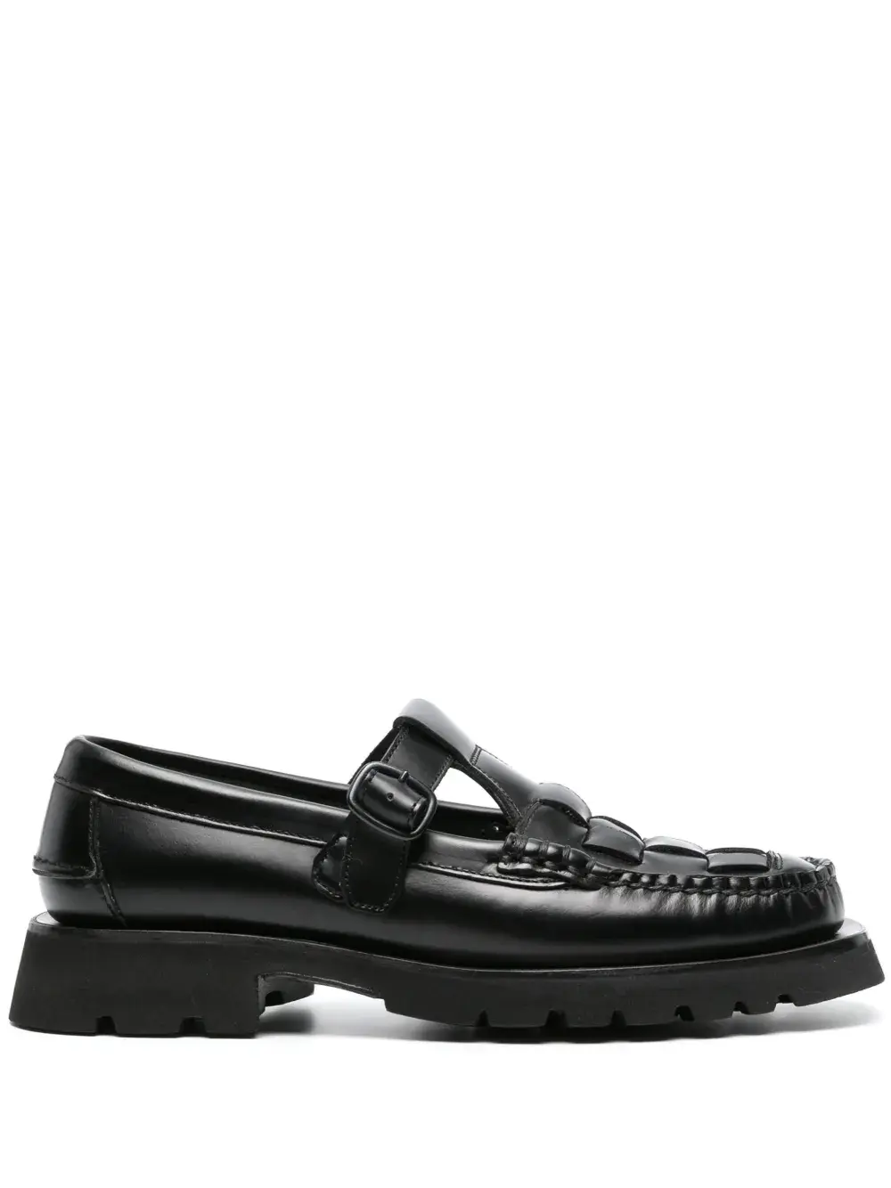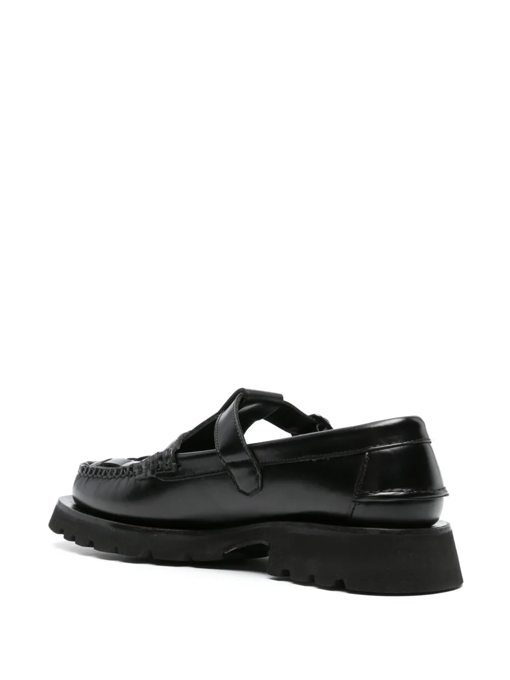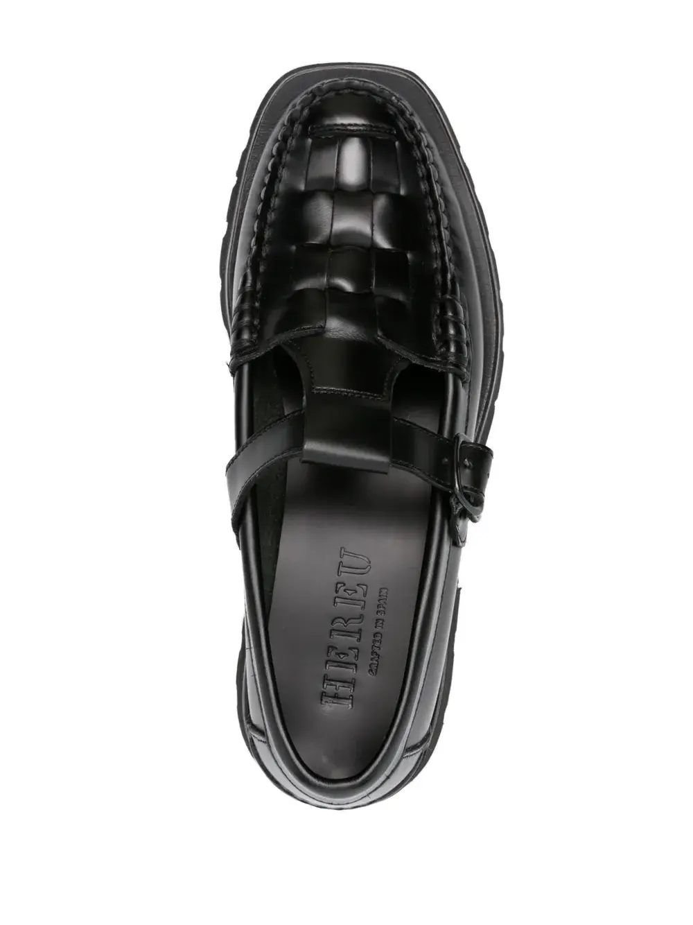 Черный, телячья кожа, квадратный носок, Т-образная застежка, кожаная стелька с логотипом и рифленая резиновая подошва.