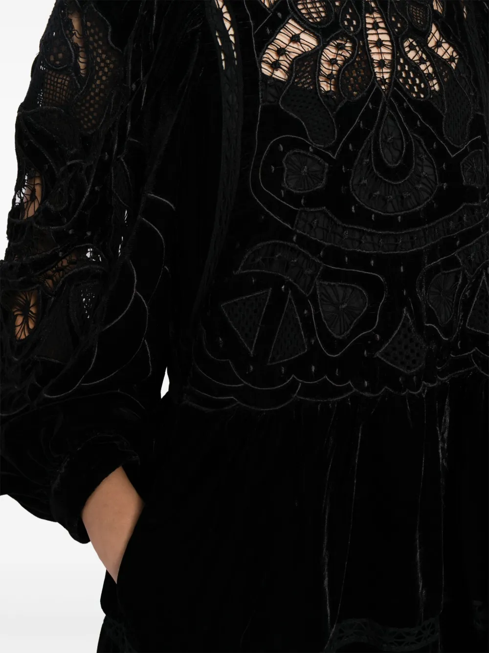 Черный, кружевная вышивка, бархат, круглый вырез, длинные рукава, цельная подкладка, расклешенный подол и асимметричный подол.