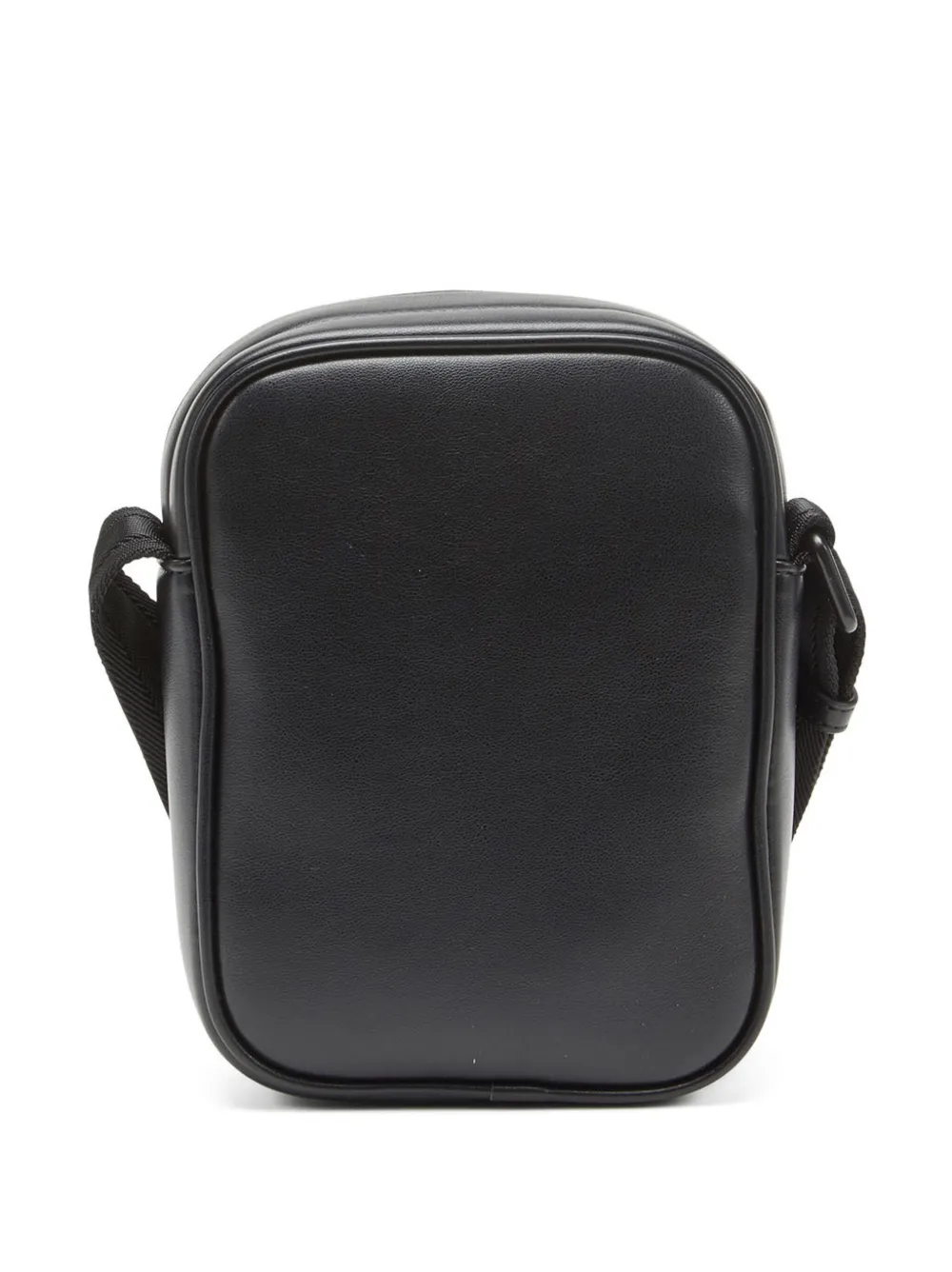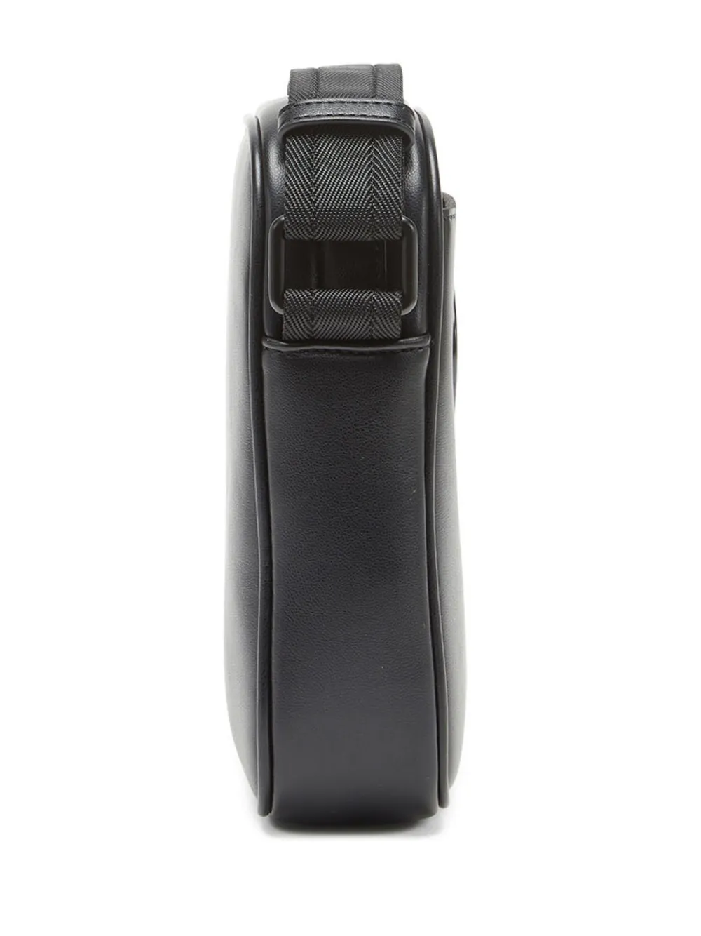 Черный, искусственная кожа, металлический логотип, застежка на молнии сверху, регулируемый ремень на плечо, прорезной карман спереди и основное отделение.
