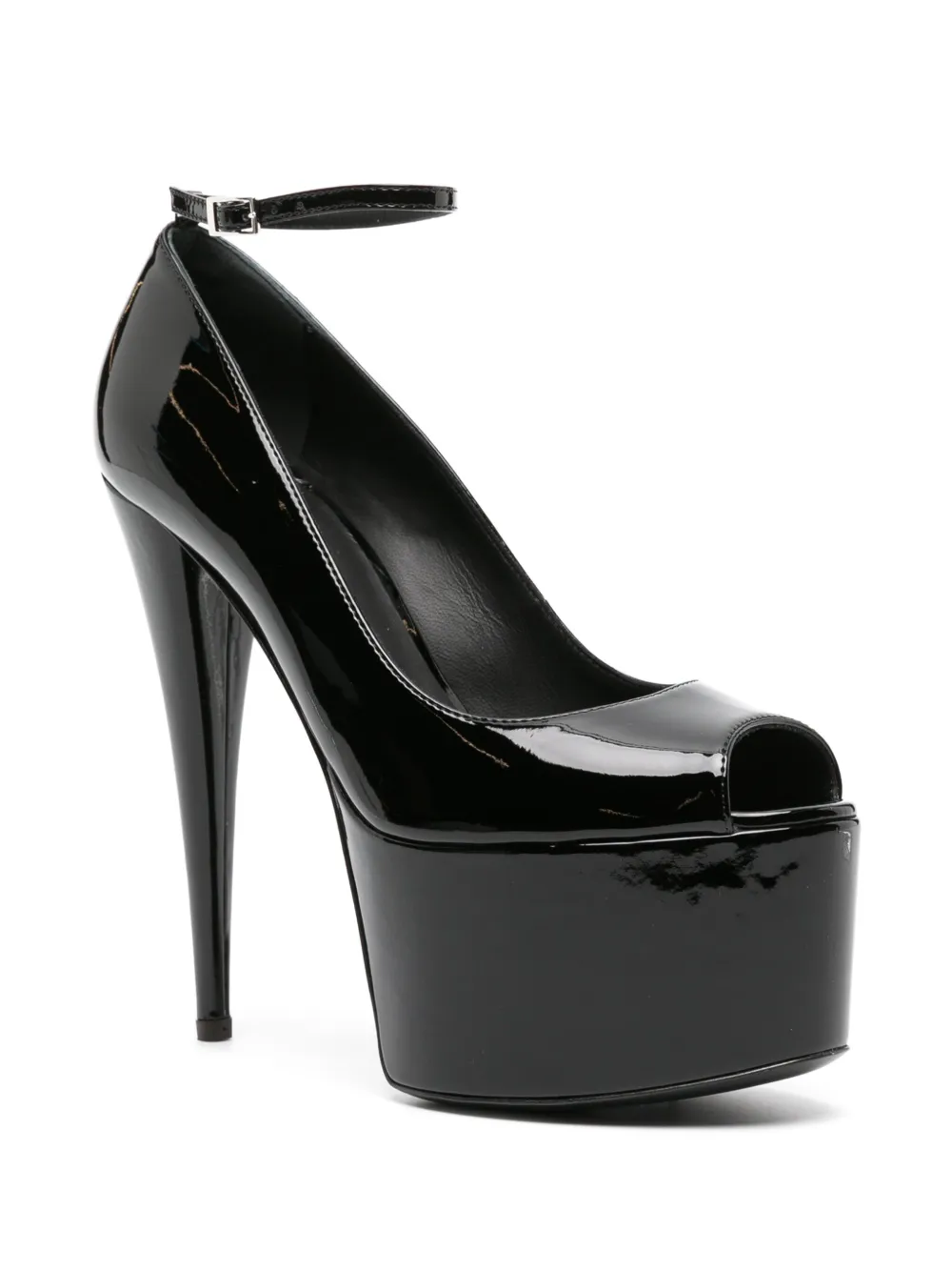 Черный, лакированная отделка, стелька с логотипом, лакированная отделка, открытый носок, ремешок на щиколотке с пряжкой и каблук на высокой шпильке.
