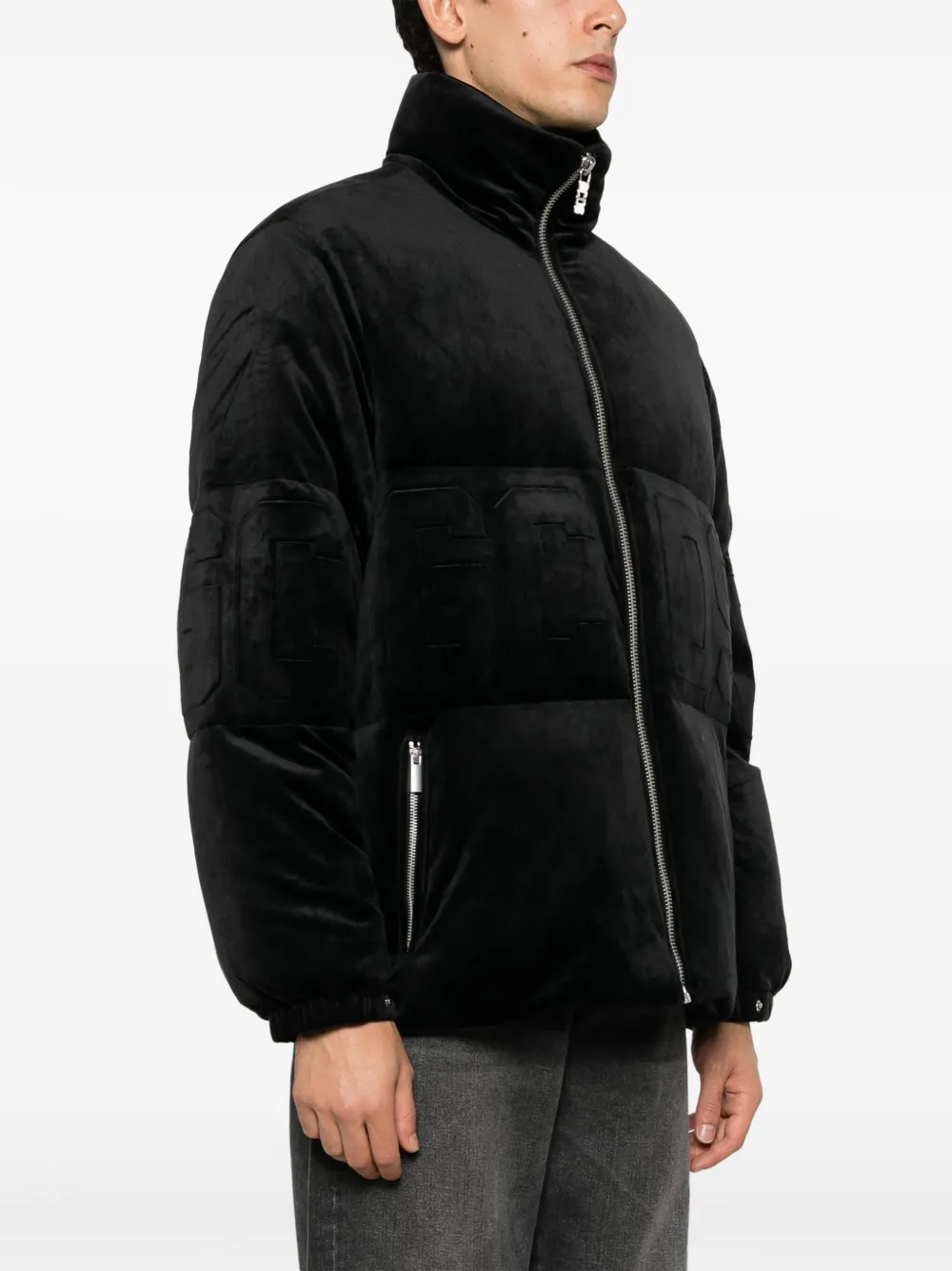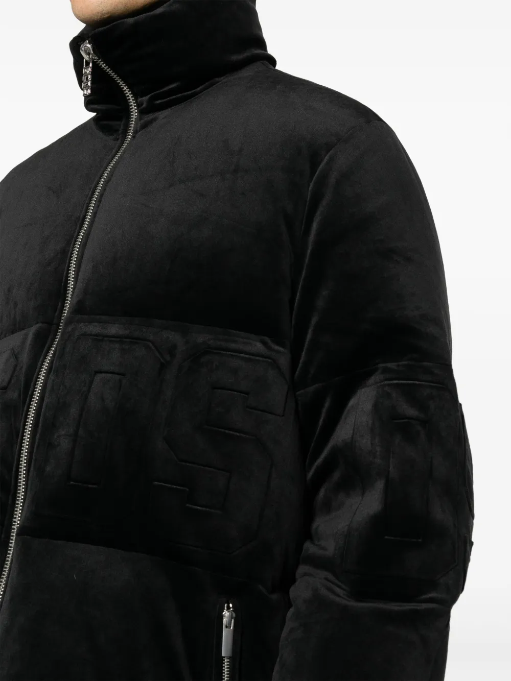 Черный, наполнитель из пуха и перьев, жатый бархат, дутый материал, тисненый логотип спереди, серебристая фурнитура, высокий воротник, застежка на молнии спереди, длинные рукава, манжеты с застежкой на кнопки, два кармана на молнии по бокам и прямой подол.