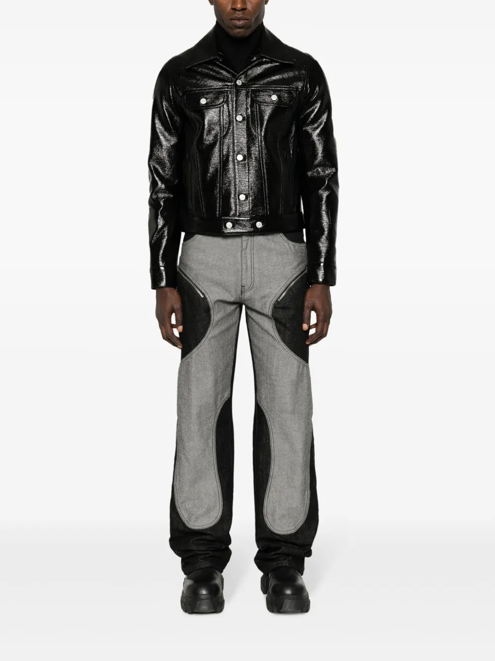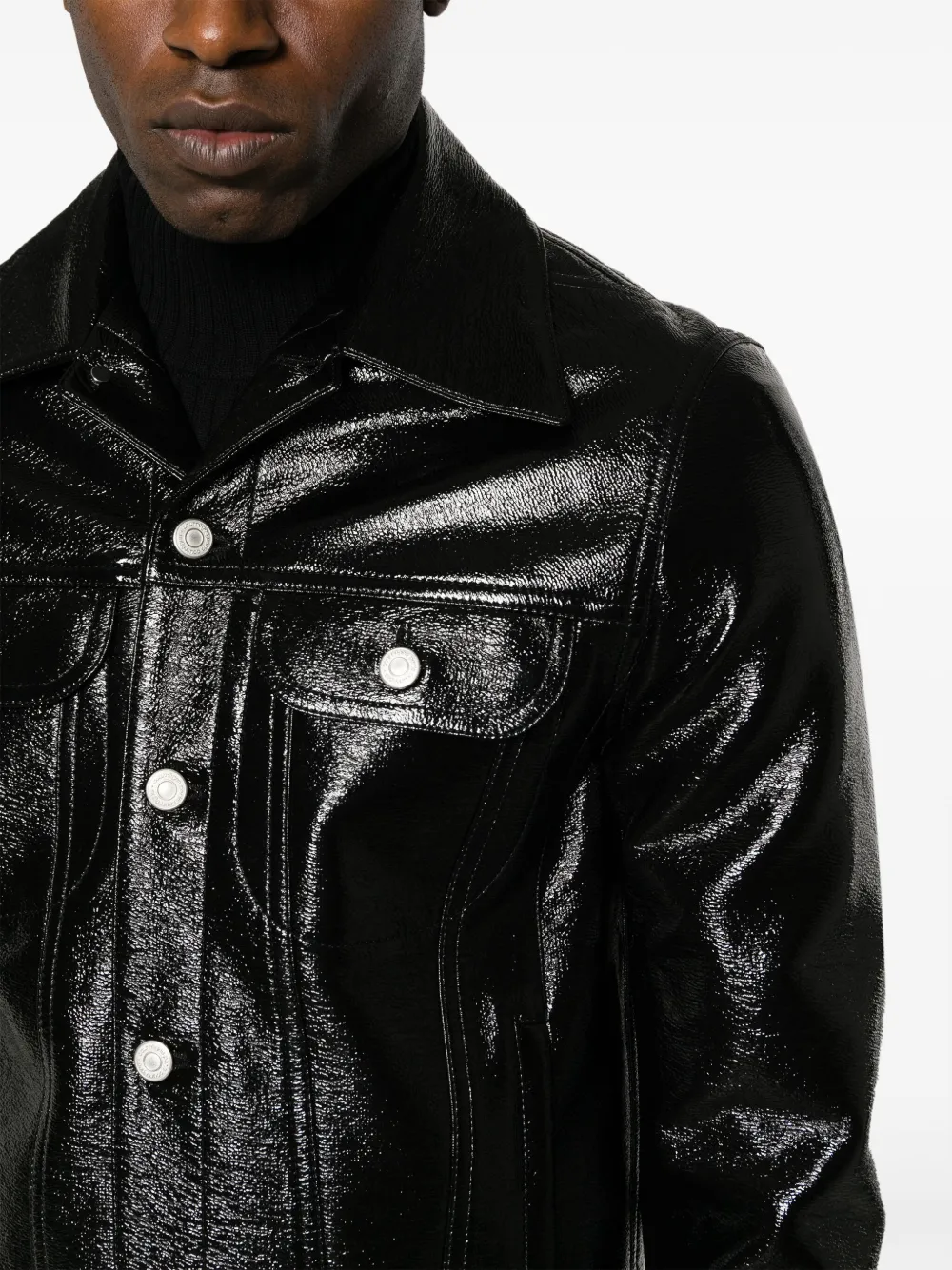 Черный, смесовый хлопок, искусственная кожа, серебристые пуговицы с тиснением, классический воротник, застежка на пуговицах спереди, два накладных кармана на груди, лакированное покрытие, два прорезных кармана по бокам и прямой подол.