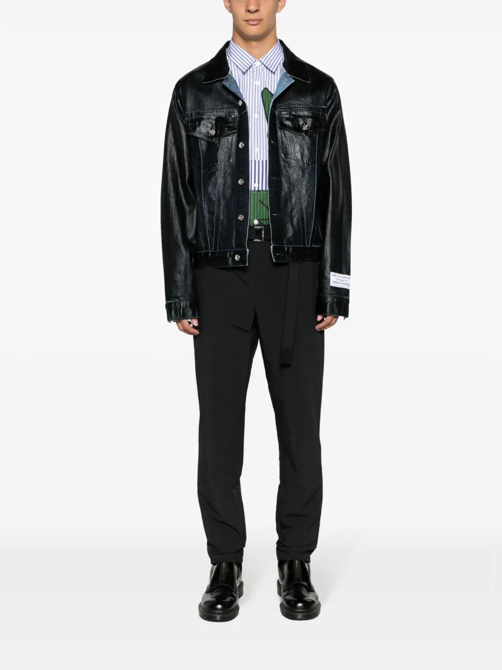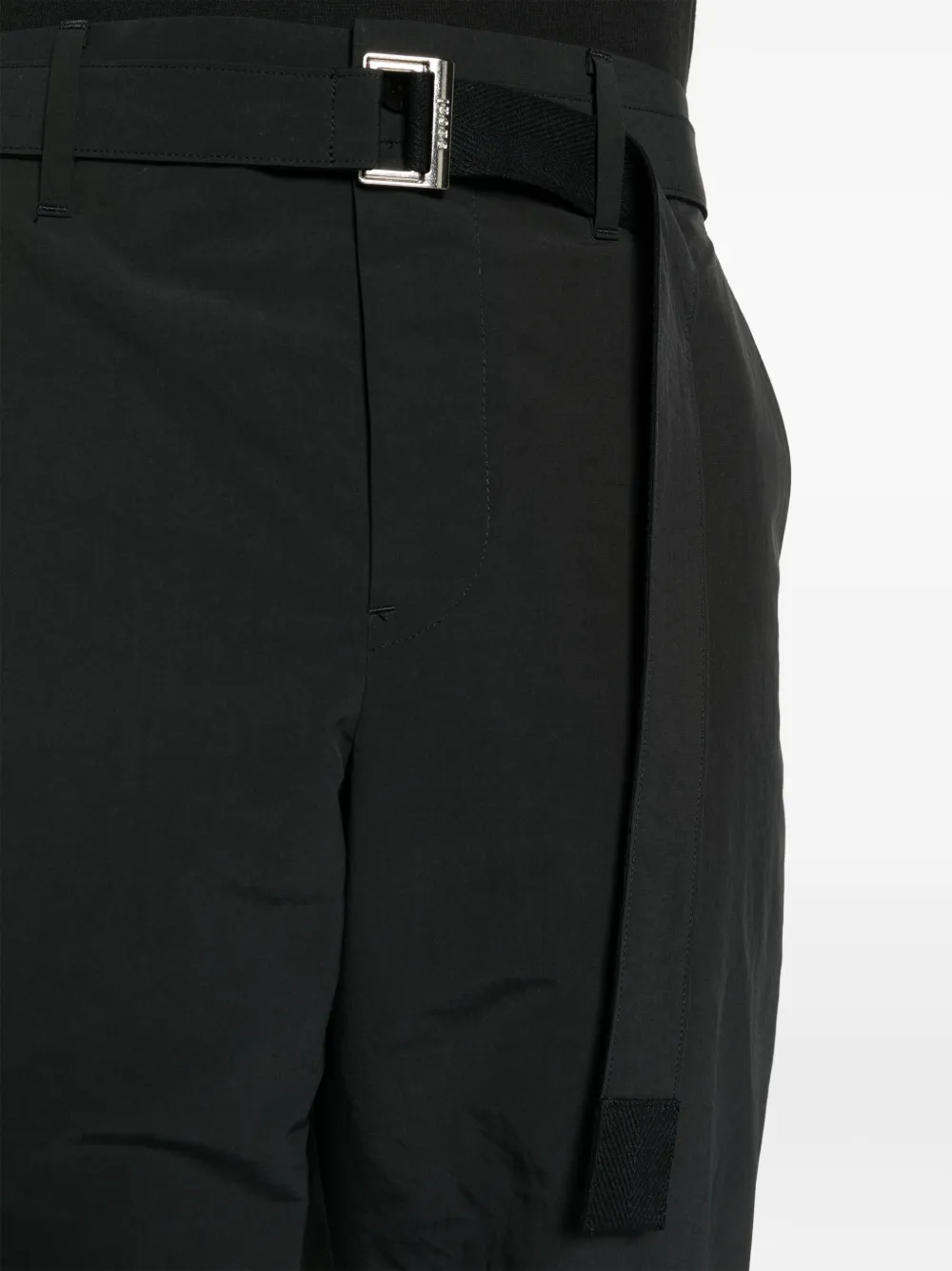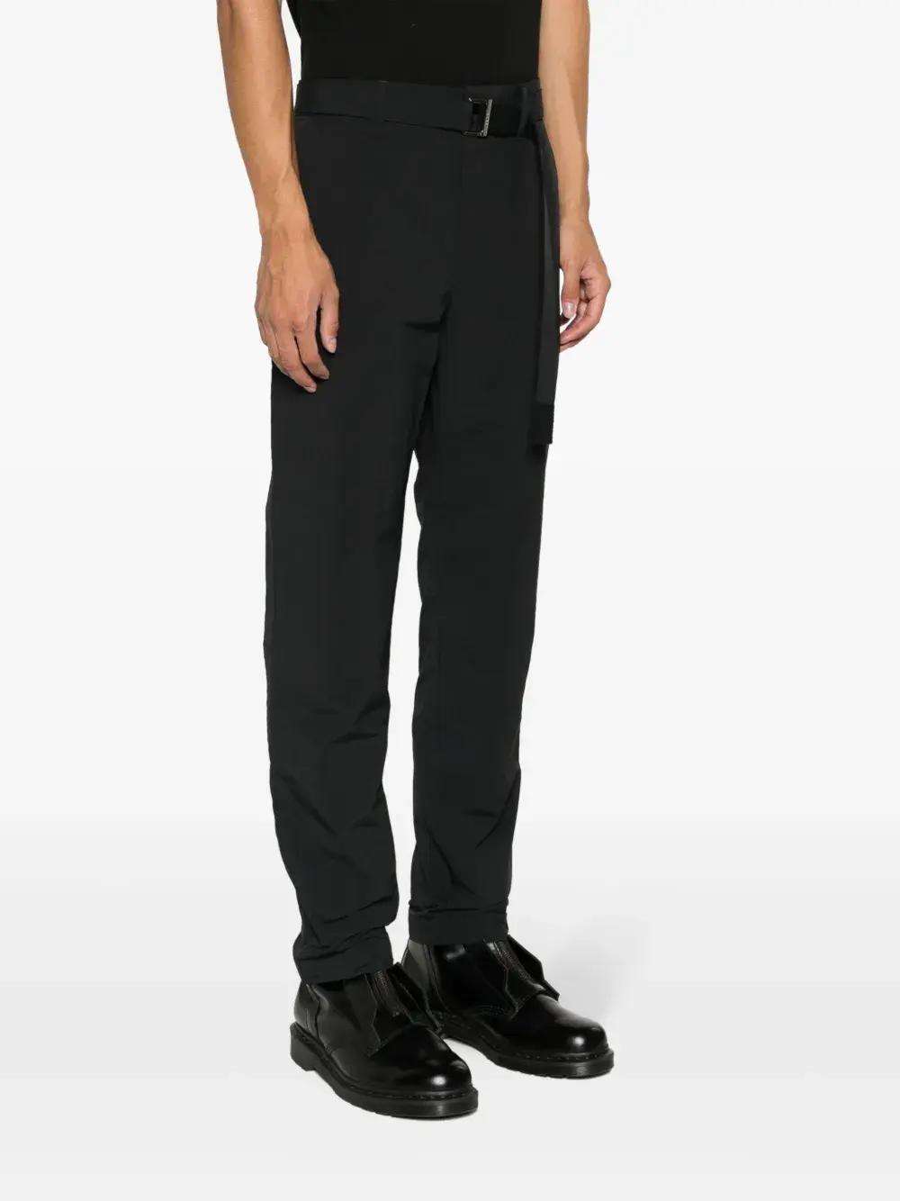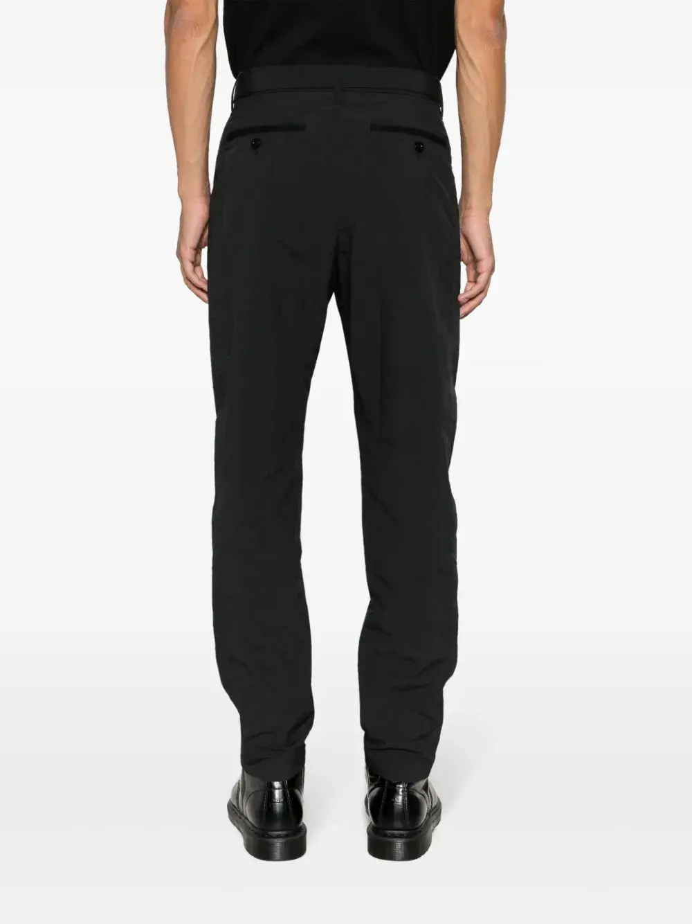Черный, хлопок, ремень на талии, прямой крой, два вшитых кармана по бокам, петли для ремня, застежка на молнии и пуговице спереди, два кармана с листочкой сзади и прямой подол.