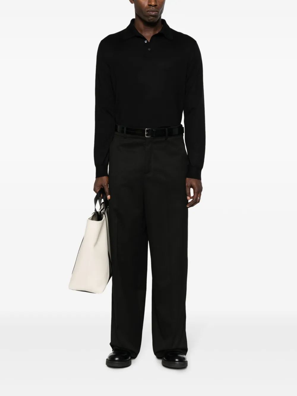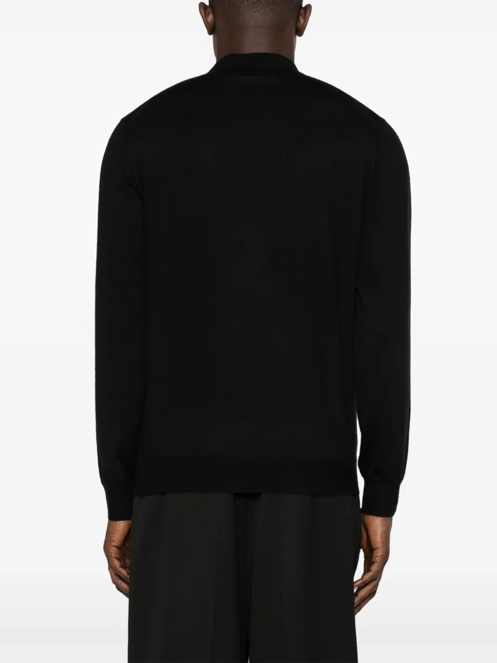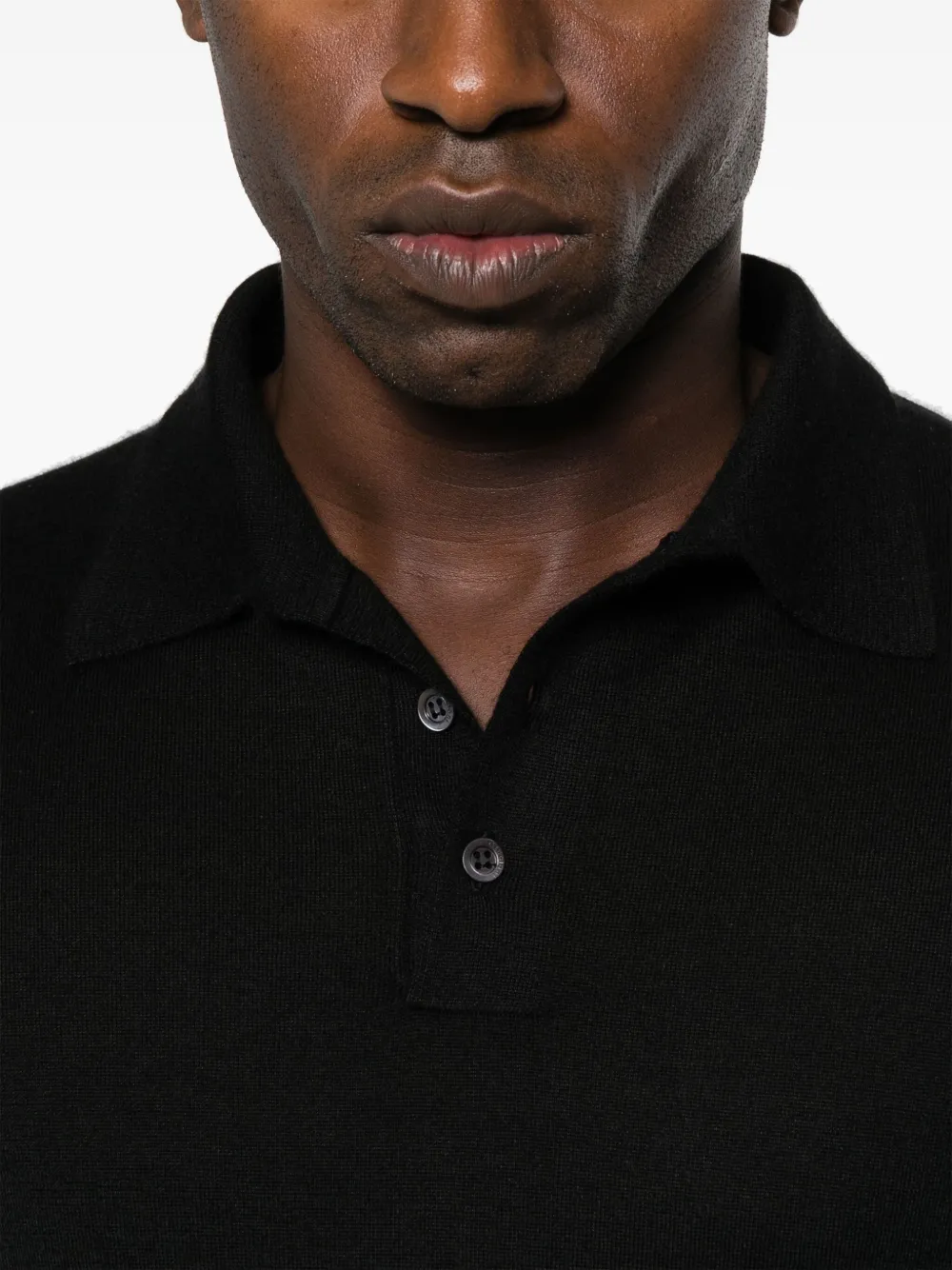 Смесь кашемира и шелка, тонкая вязка, воротник поло, планка на пуговицах спереди и длинные рукава.