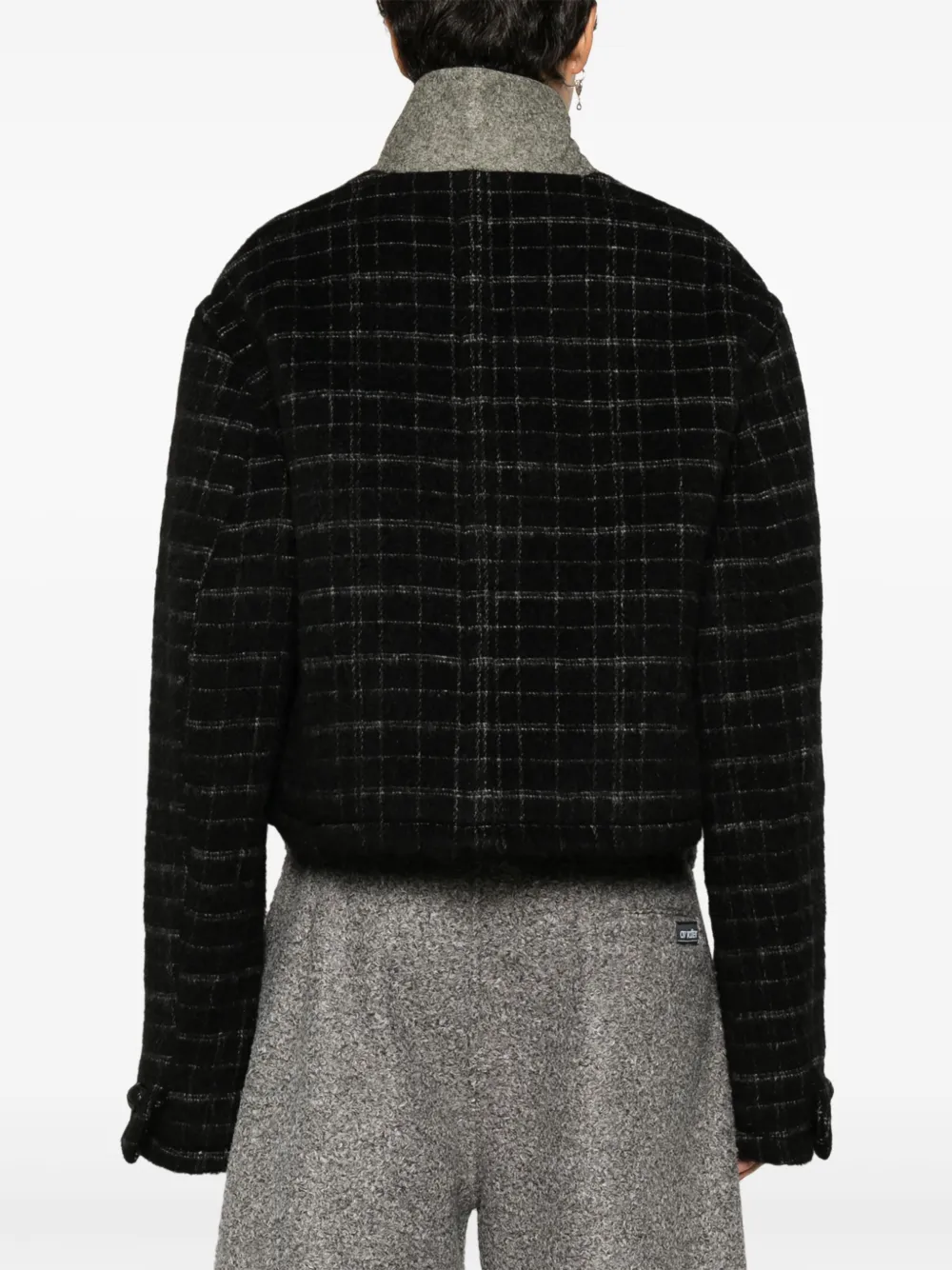 Черный, смесовая шерсть, клетчатый узор, цветочная вышивка спереди, воротник «челси», застежка на пуговицах спереди, длинные рукава, два прорезных кармана спереди, прямой подол и укороченная длина.