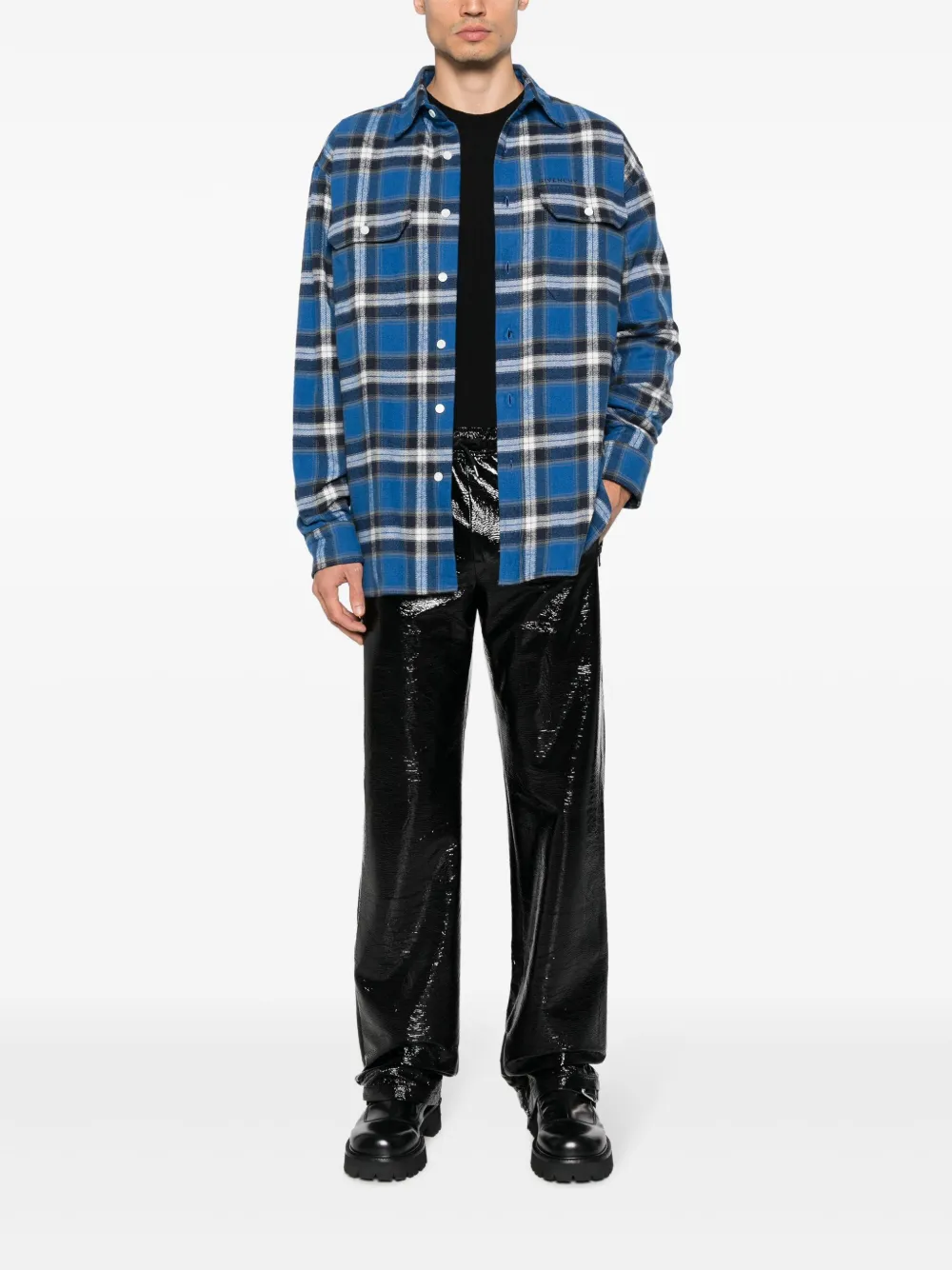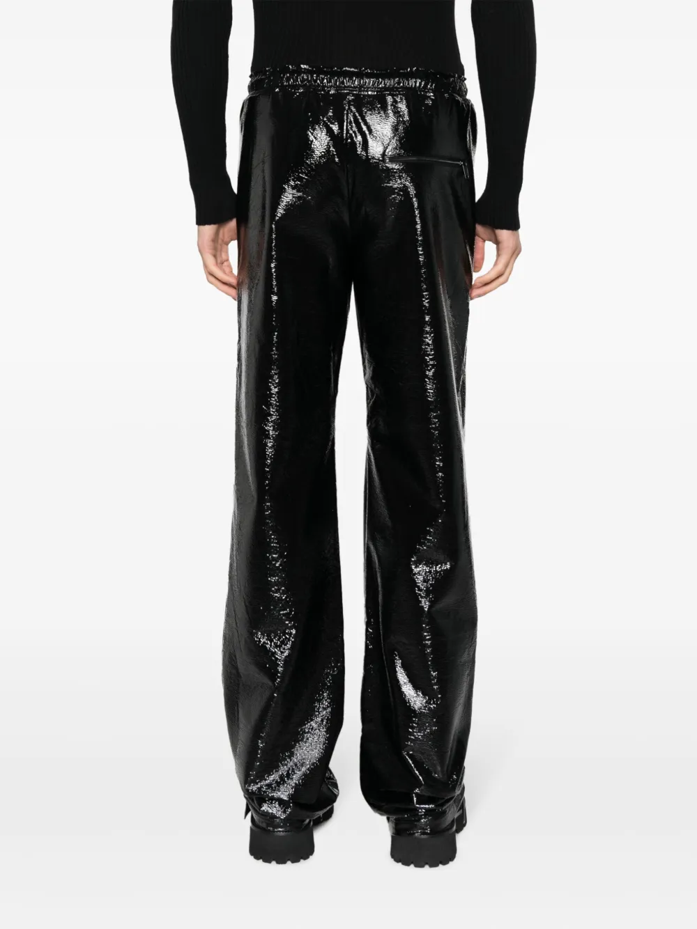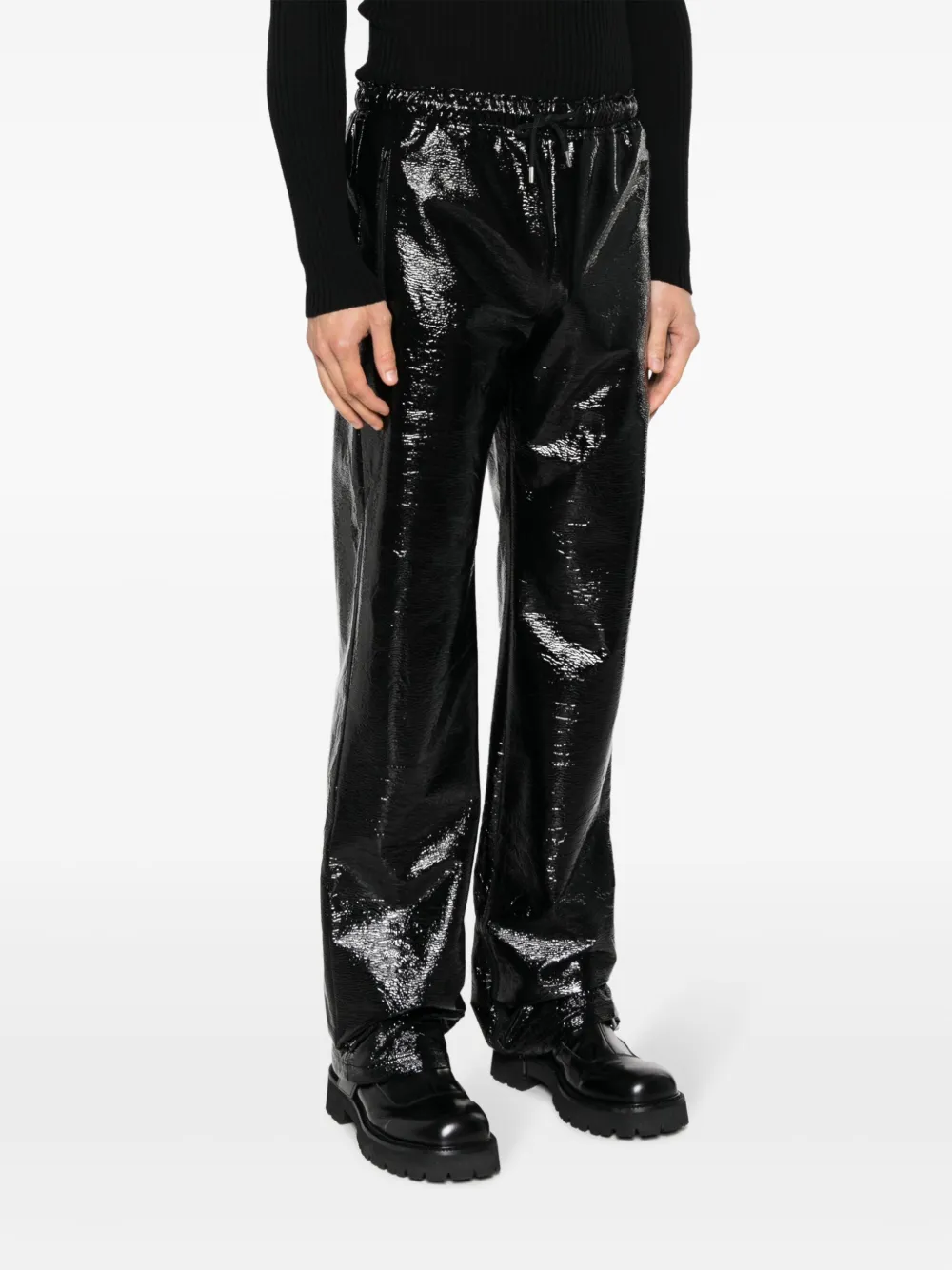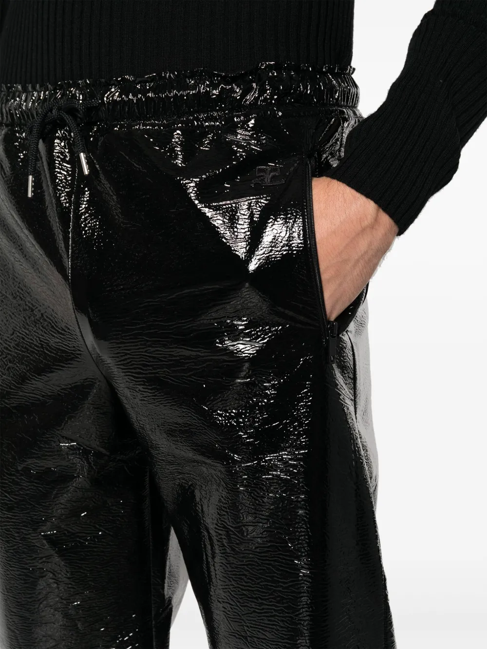 Черный, глянцевая фактура, кулиска на талии, средняя посадка, прямой крой, два вшитых кармана по бокам и карман на молнии сзади.