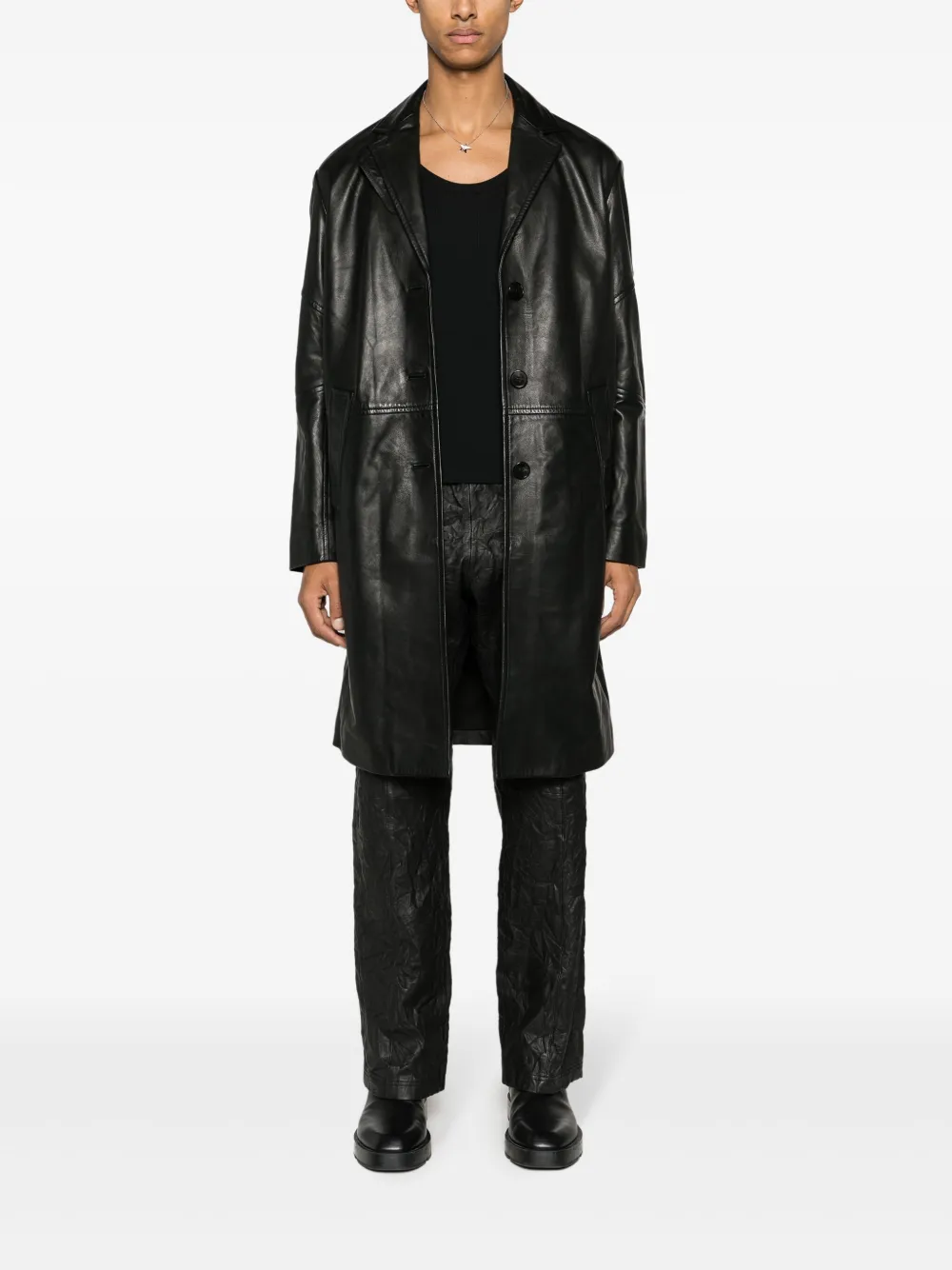 Черный, овечья кожа, гладкая текстура кожи, высокий воротник, съемная вставка для защиты шеи, зазубренные лацканы, застежка на пуговицах спереди, длинные рукава и прямой подол. Это унисекс-модель. Обратите внимание, что для нее используется мужская размерная сетка.