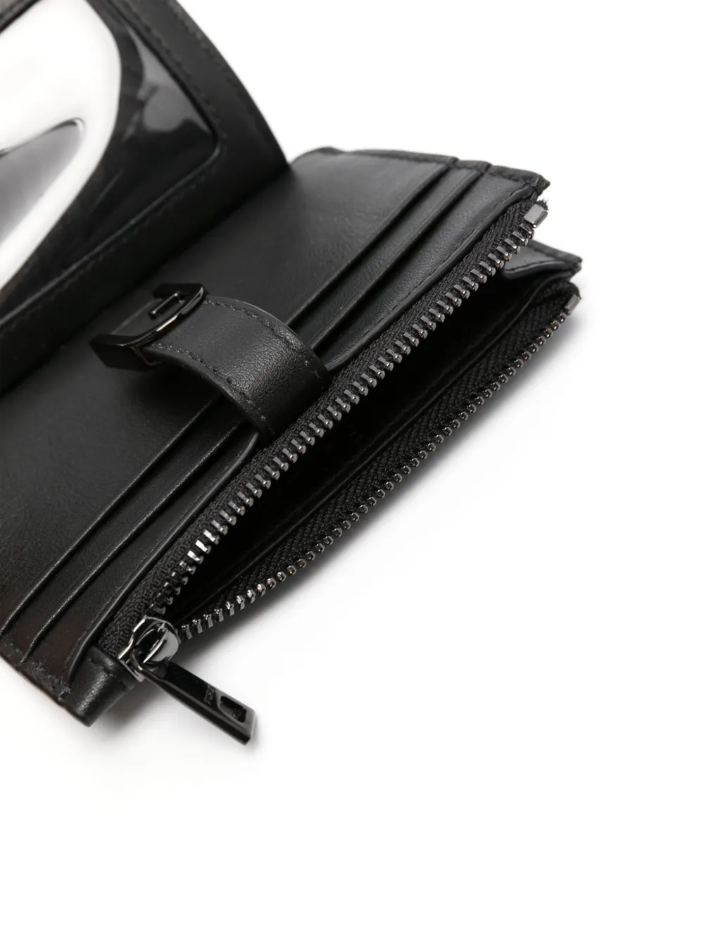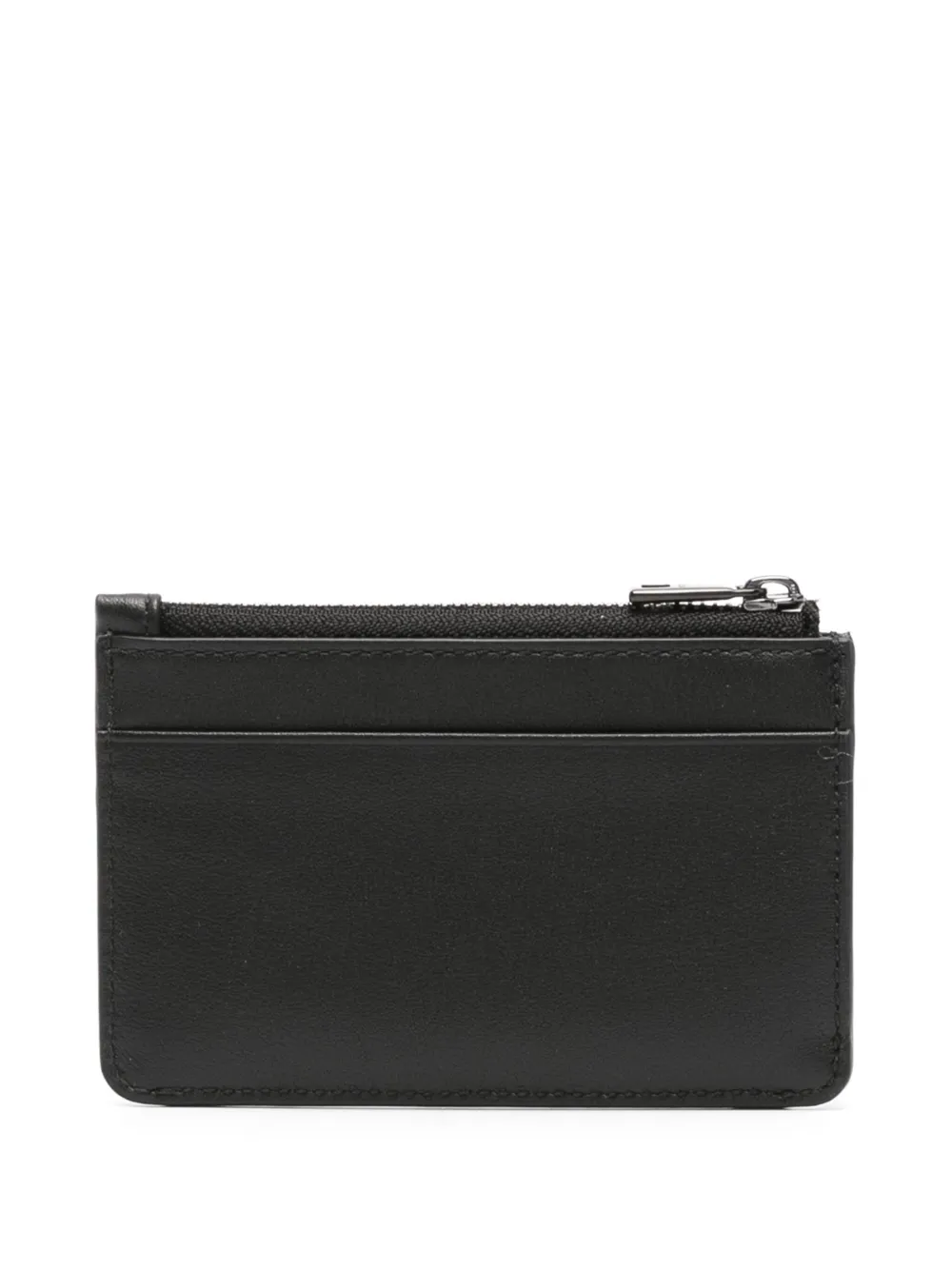 Черный, телячья кожа, гладкая текстура кожи, логотип в тон, прямоугольная форма, застежка на молнии сверху и отделения для карт.