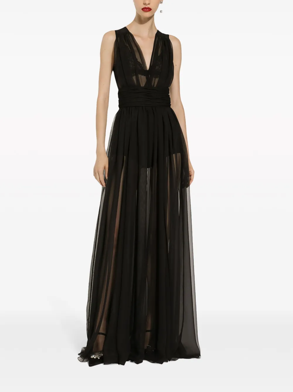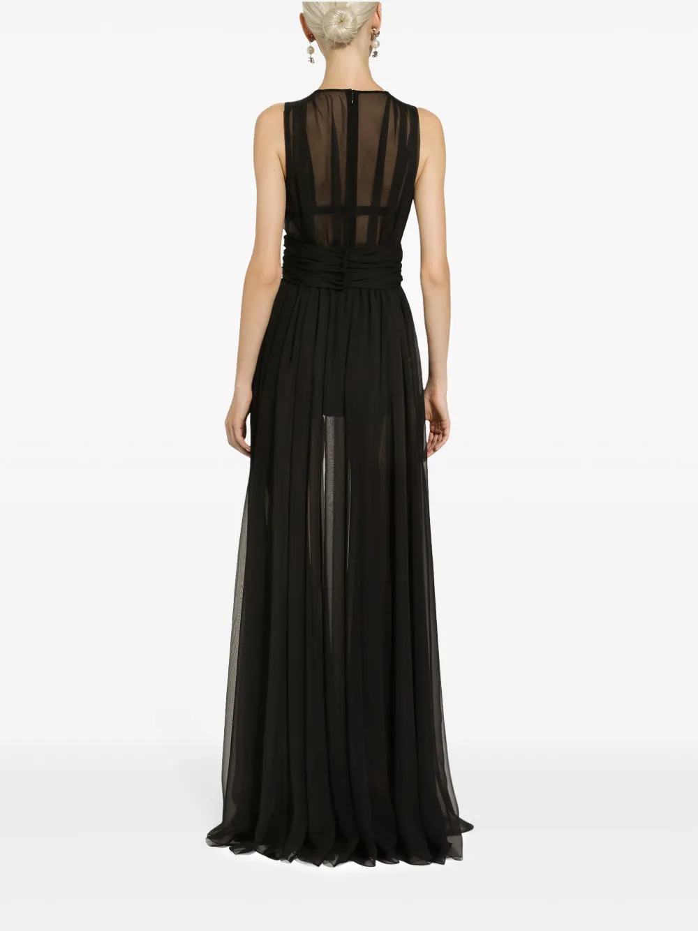 Черный, полупрозрачный дизайн, плиссированная модель, V-образный вырез, без рукавов, потайная застежка на молнии сзади и длина макси.