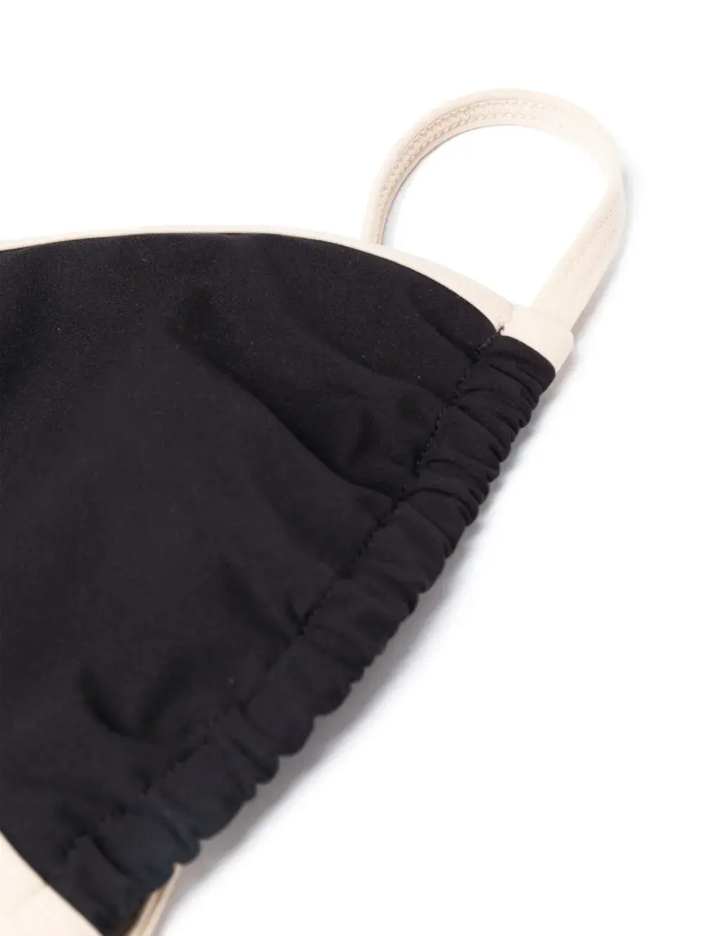 Черный, светло-бежевый, контрастные края, треугольная чашка, завязки вокруг шеи, застежка на завязке сзади и эластичный дизайн. Пожалуйста, примеряйте купальники и пляжные шорты только поверх собственного белья.
