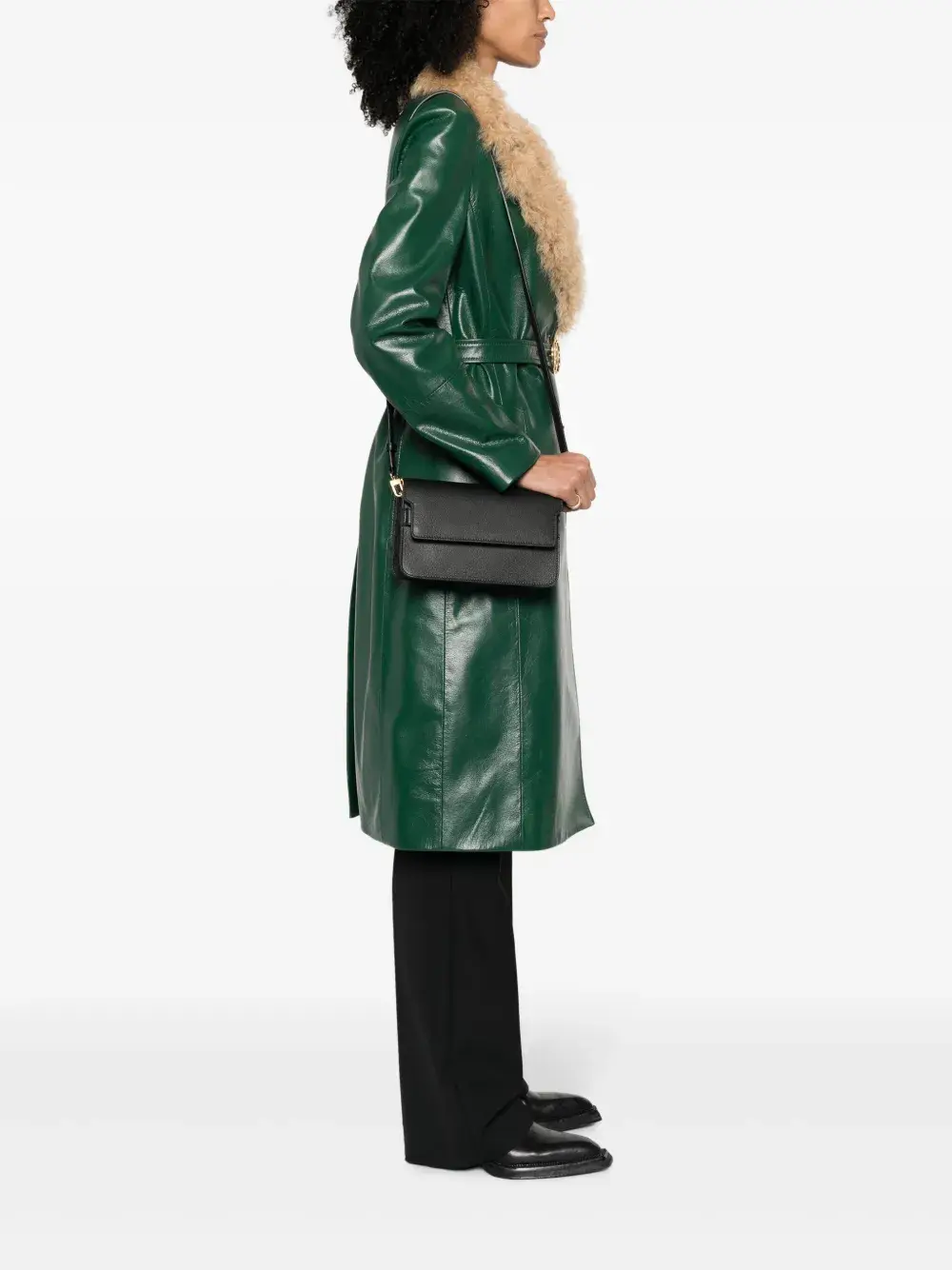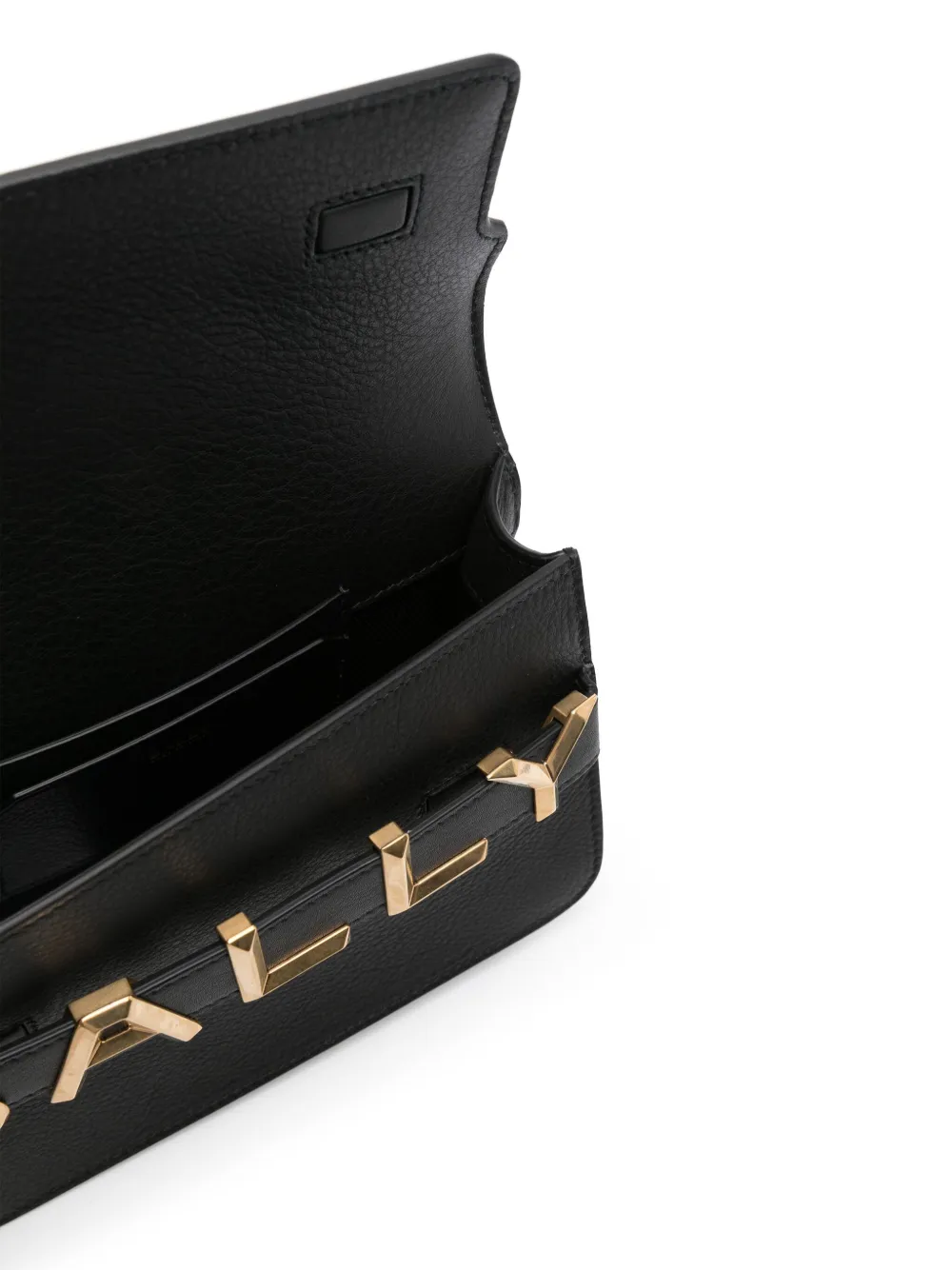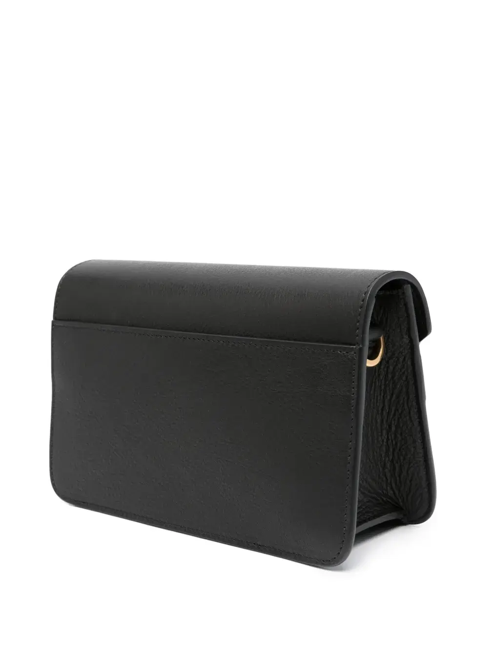 Черный, телячья кожа, золотистый логотип, съемный регулируемый ремень на плечо, застежка с клапаном спереди, основное отделение и внутренние отделения для карт.