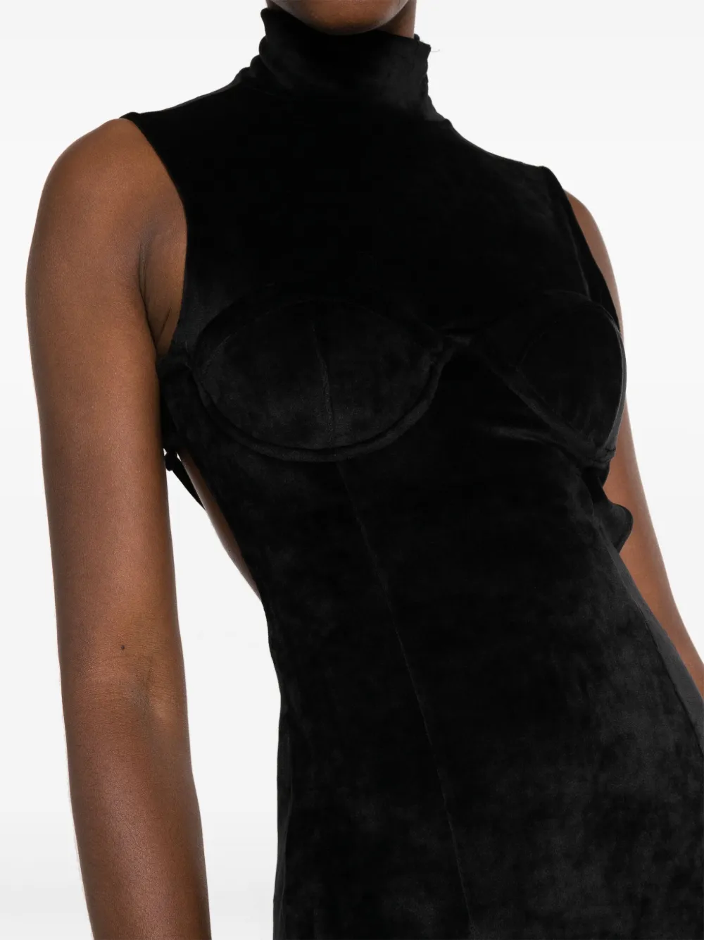 Черный, искусственная замша, эластичный материал, золотистый металлический логотип, вырезные детали, высокий воротник, без рукавов, прямой подол и длина до бедер.