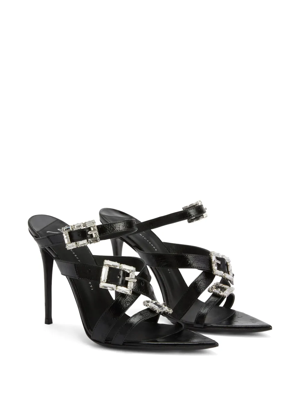 Черный, кожа, украшения из горного хрусталя, открытый носок, заостренный носок, застежка на пряжке и ремешке, кожаная стелька с логотипом и каблук на высокой шпильке.