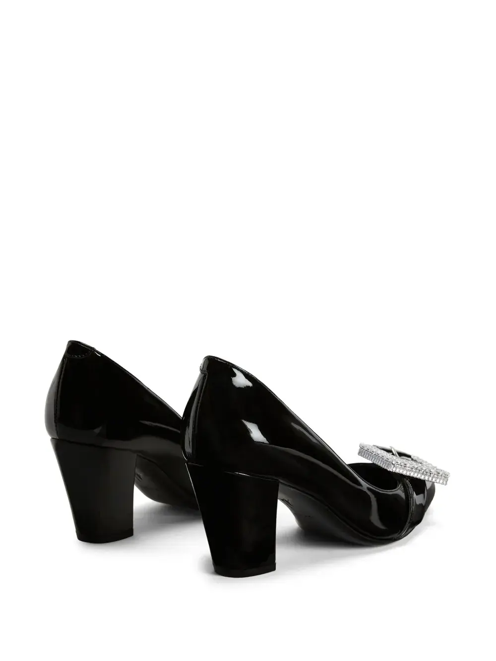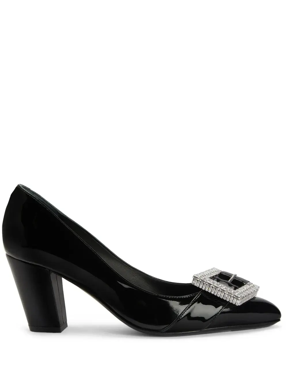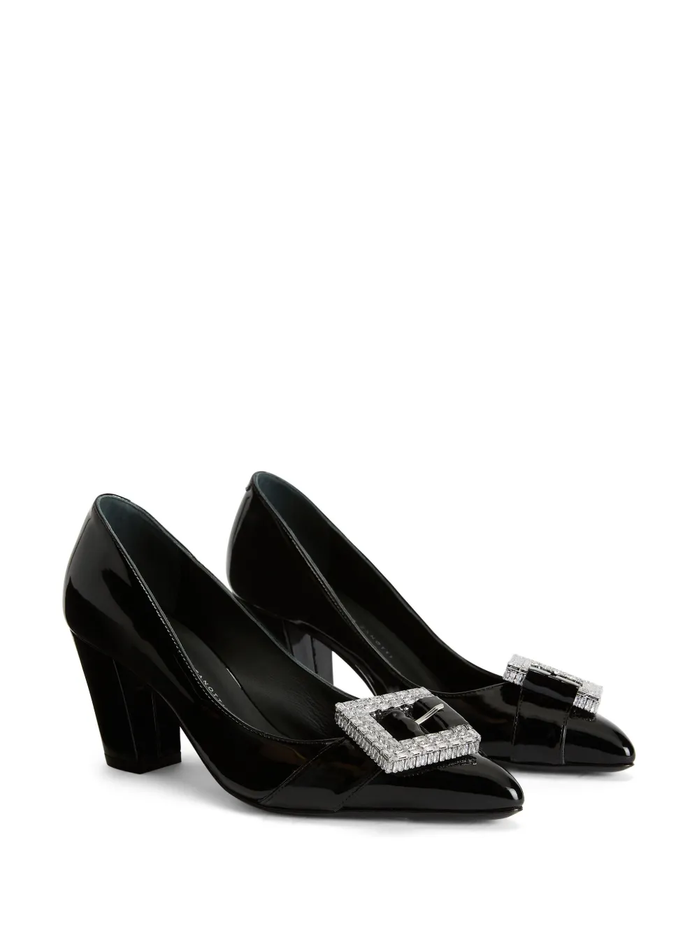 Черный, кожа, лакированная отделка, пряжка с кристаллами, заостренный носок, стелька с логотипом, блочный каблук средней высоты и модель без застежки.