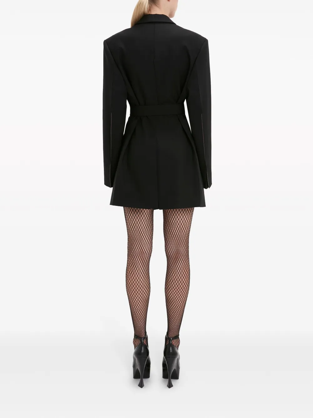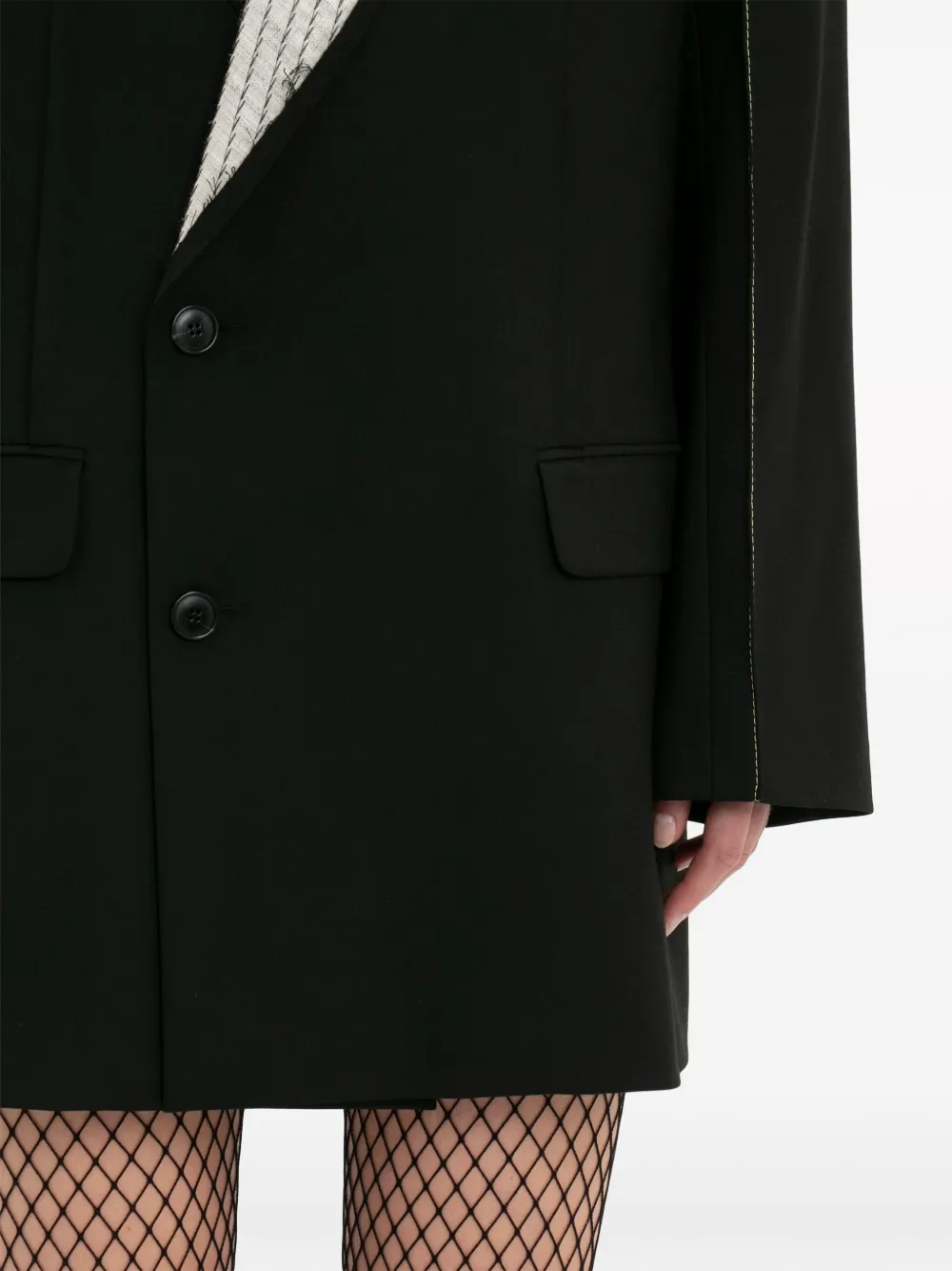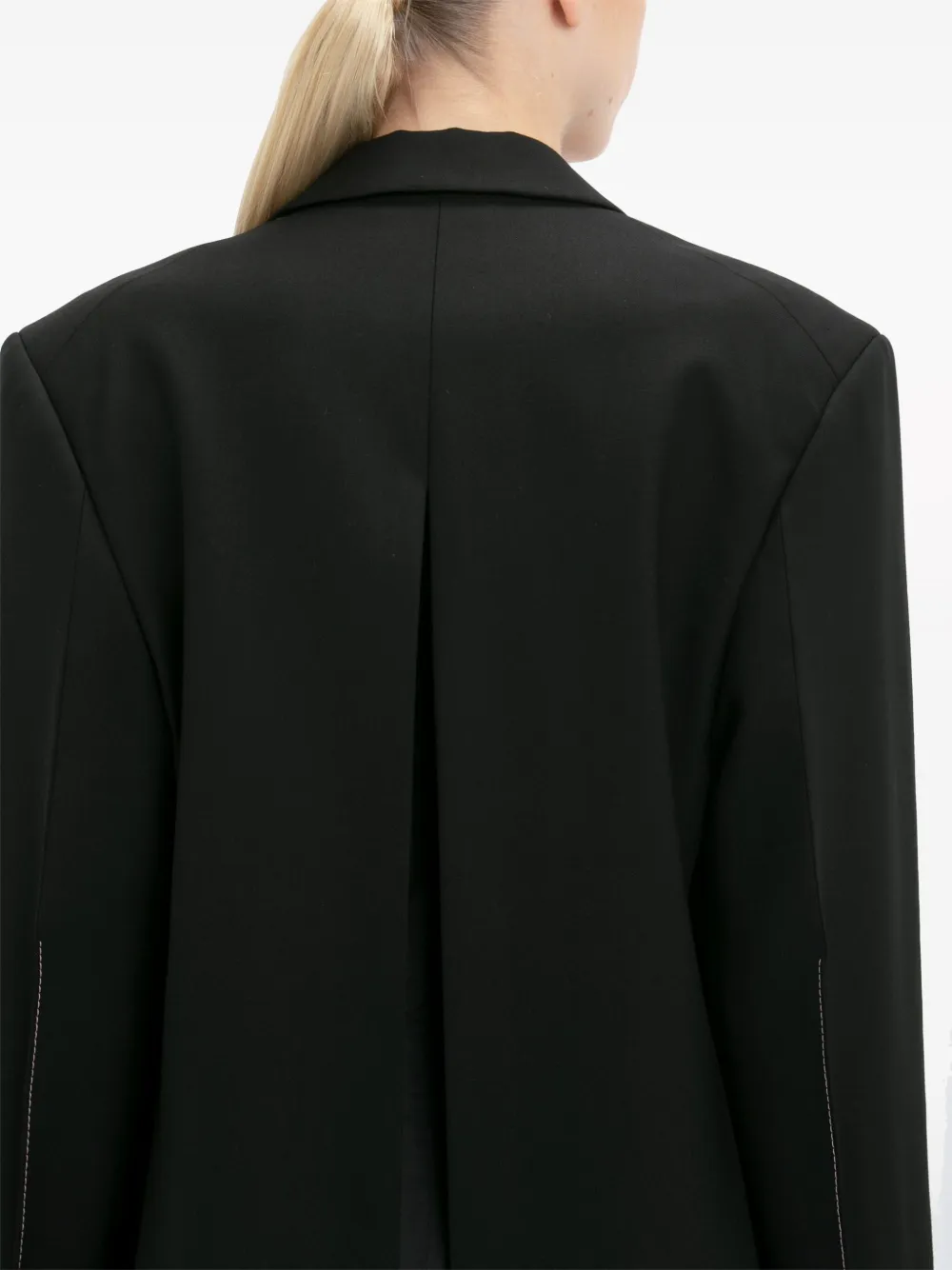 Черный, декоративные швы, заостренные лацканы, двубортная застежка на кнопки, длинные рукава, прорезной карман на груди, два передних кармана с клапанами, вырез сзади, длина до бедер и прямой подол.