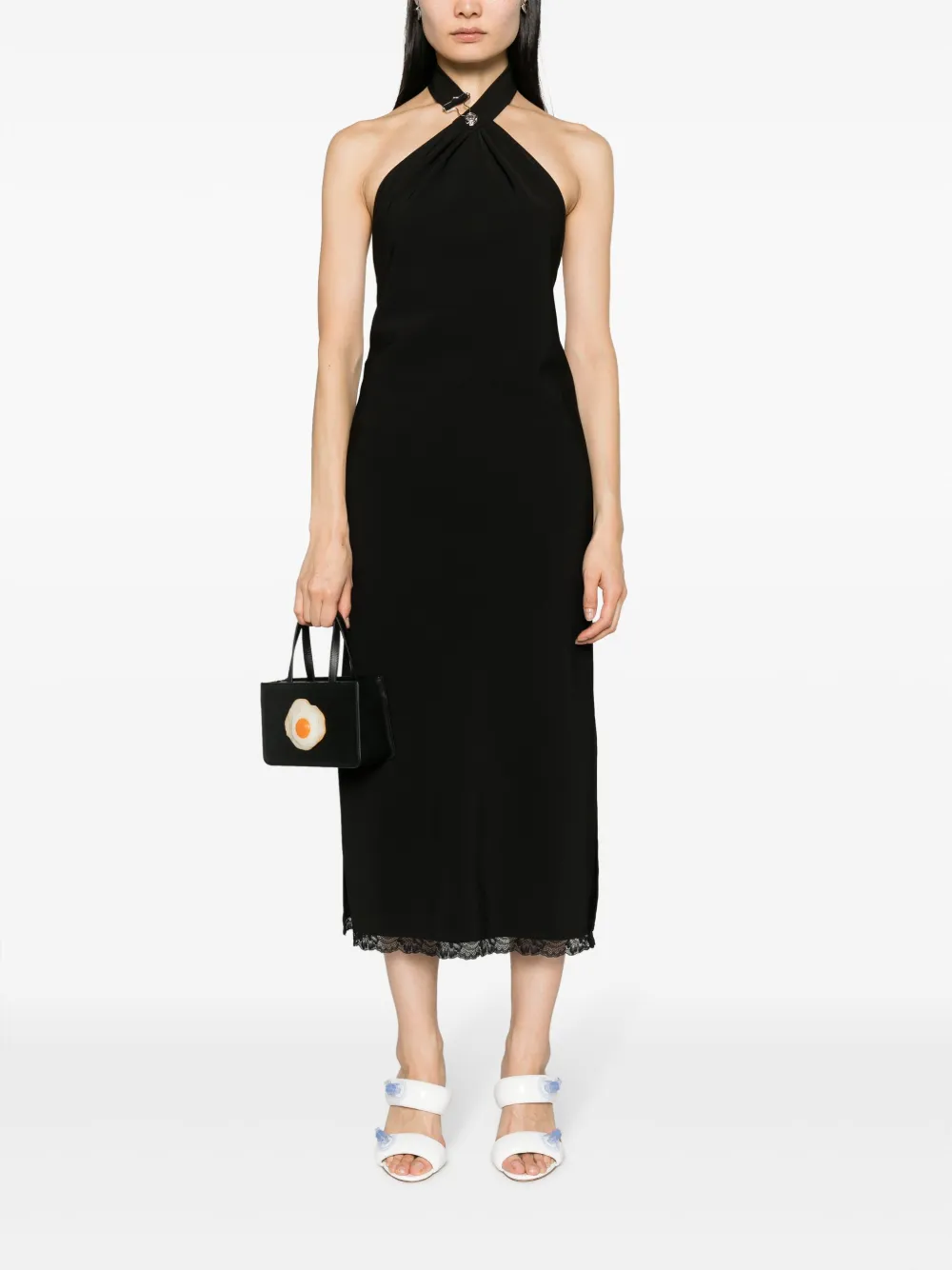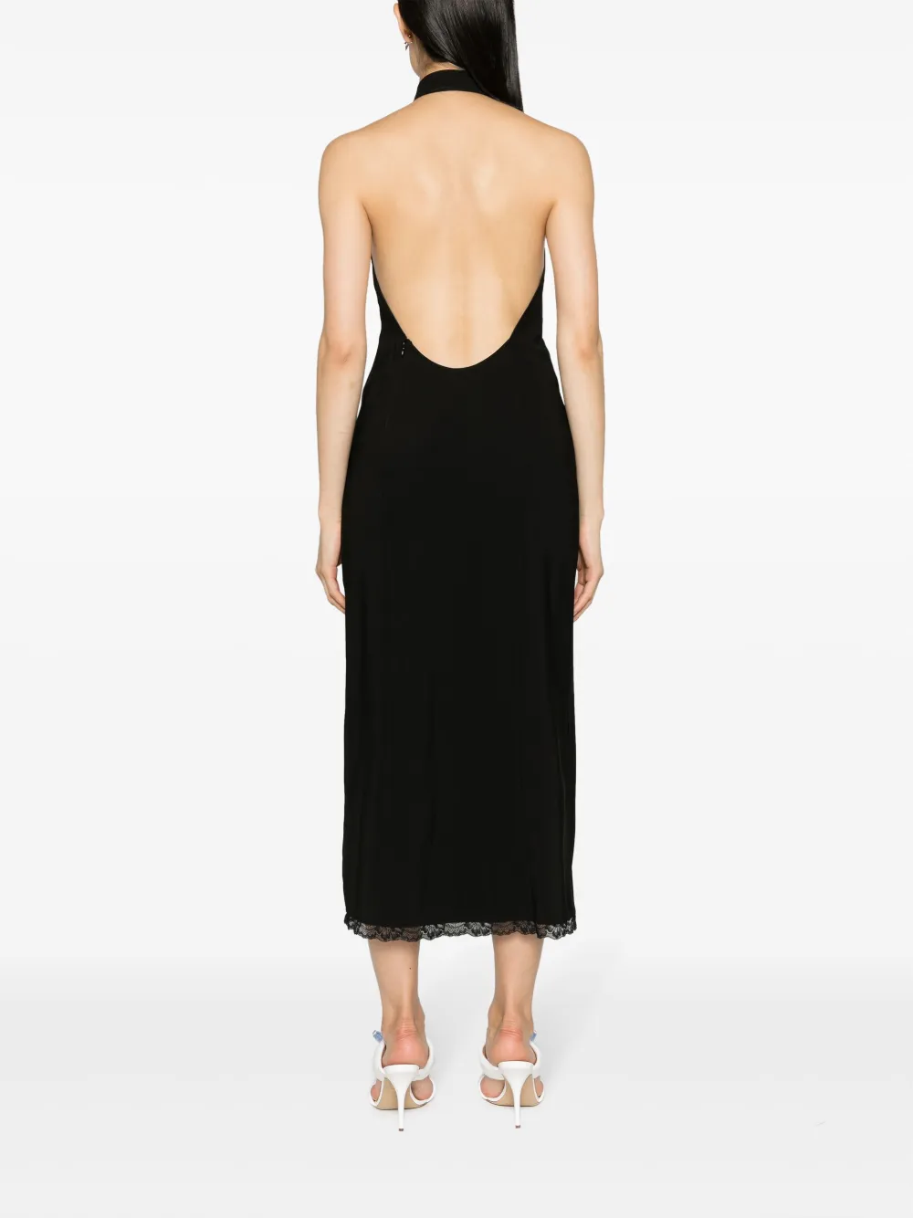 Черный, вставки из цветочного кружева, вырез-петля халтер, без рукавов, открытая спина, длина до середины икры и прямой подол.