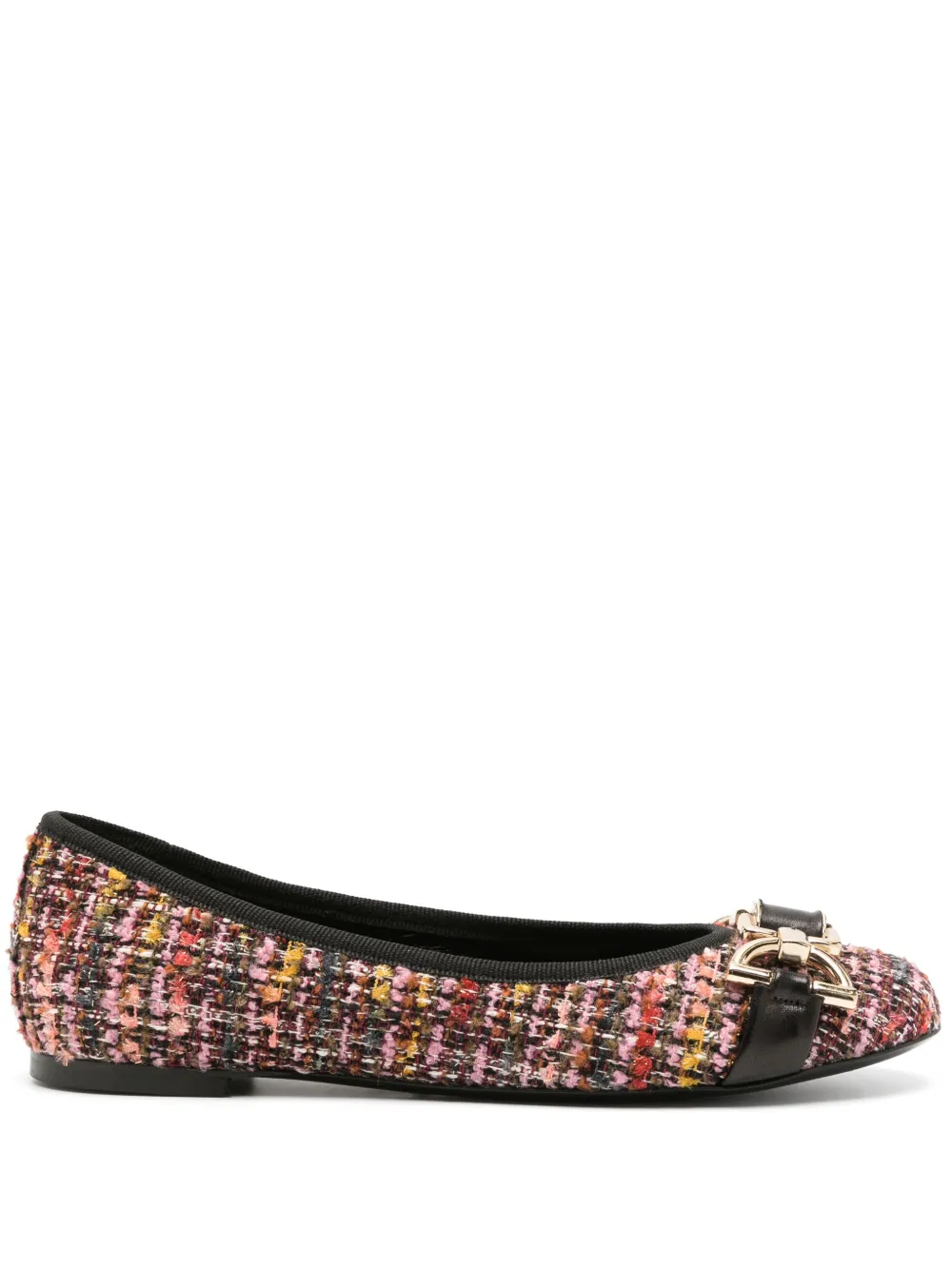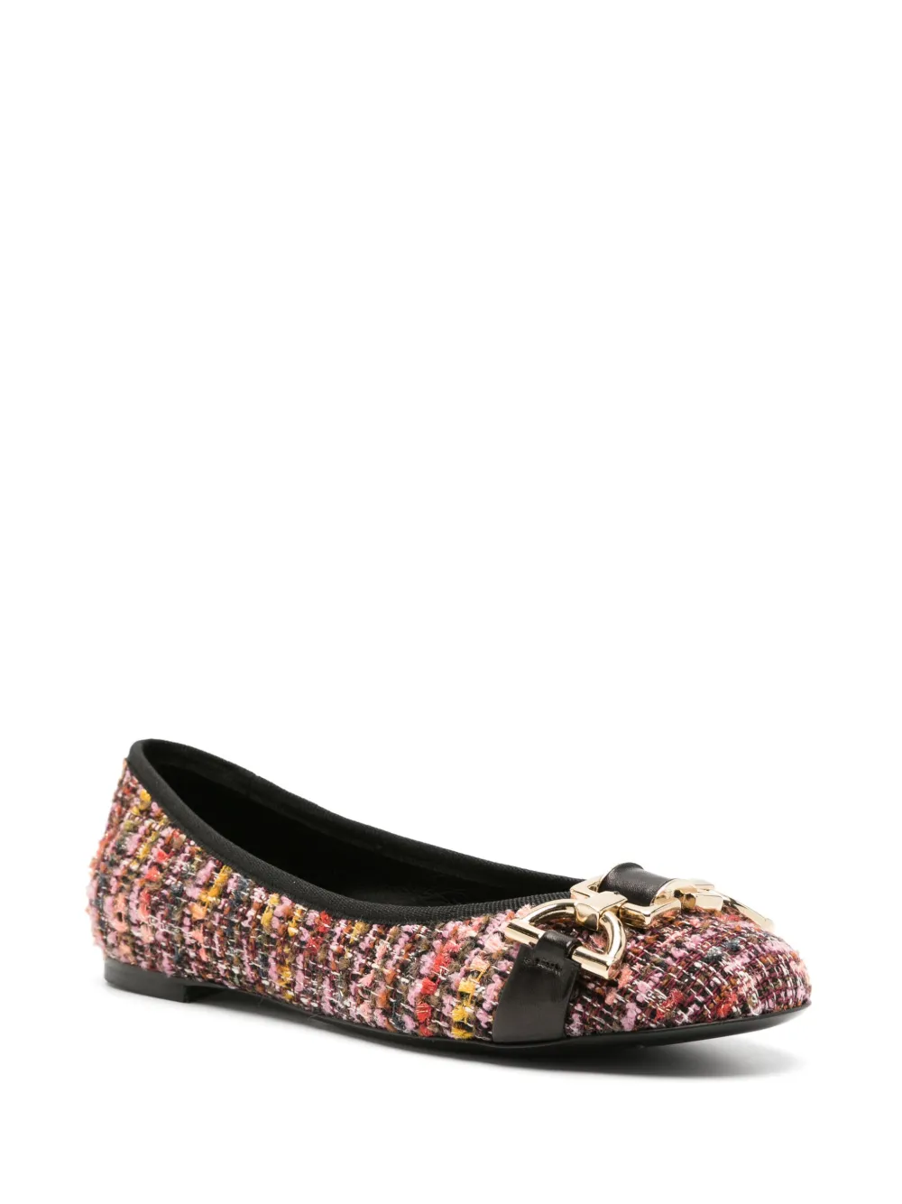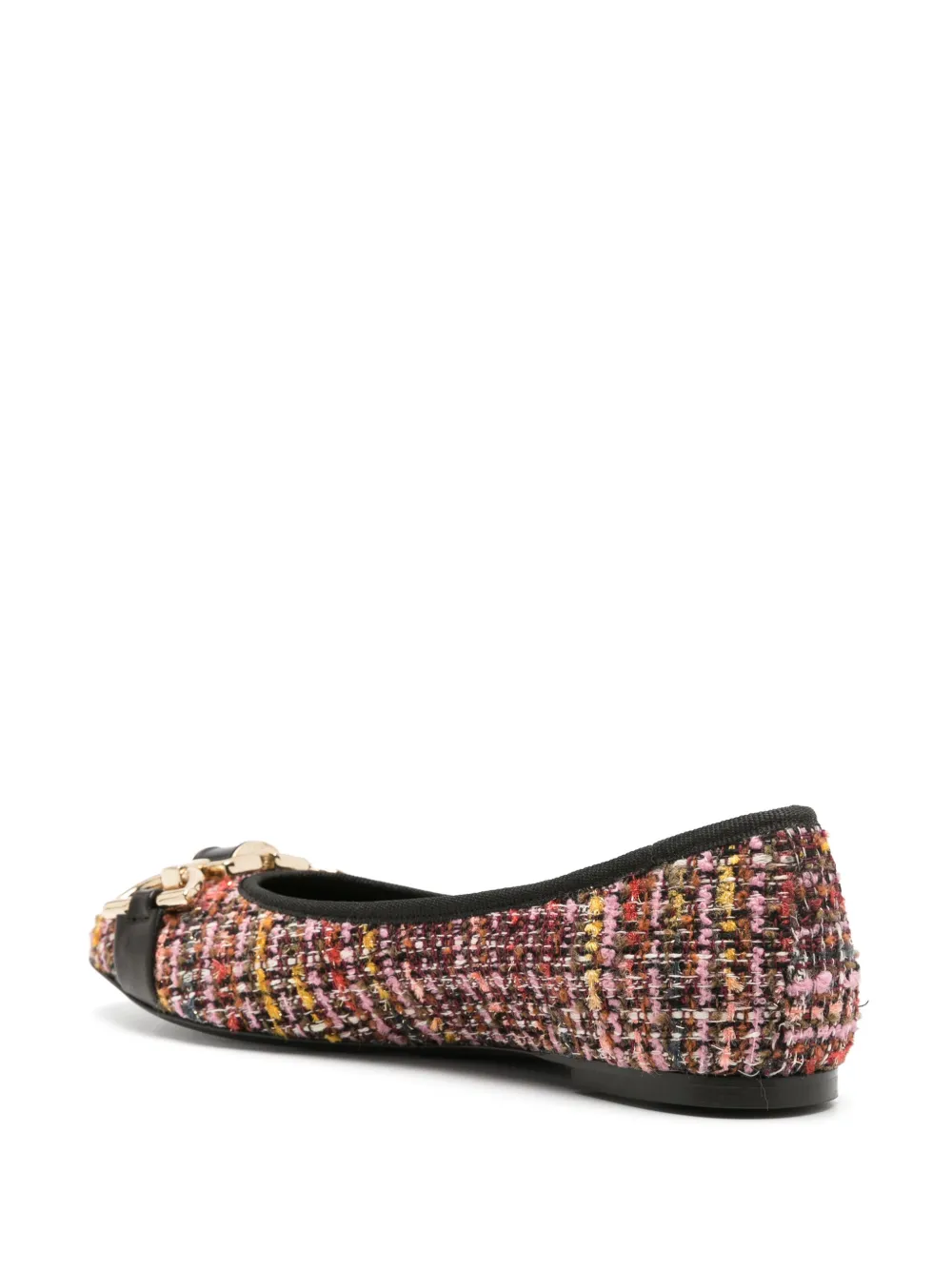 Черный/разноцветный, ткань букле, цепочка, золотистая фурнитура, модель без застежки, закругленный носок, кожаная подкладка, кожаная стелька с логотипом и плоская резиновая подошва. В комплект входит мешок-пыльник для хранения.