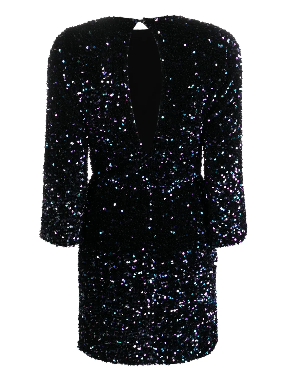 Черный, украшение из пайеток, застежка на пуговицы сзади, круглый вырез, длинные рукава, вырез сзади, прямой подол и длина до бедер.