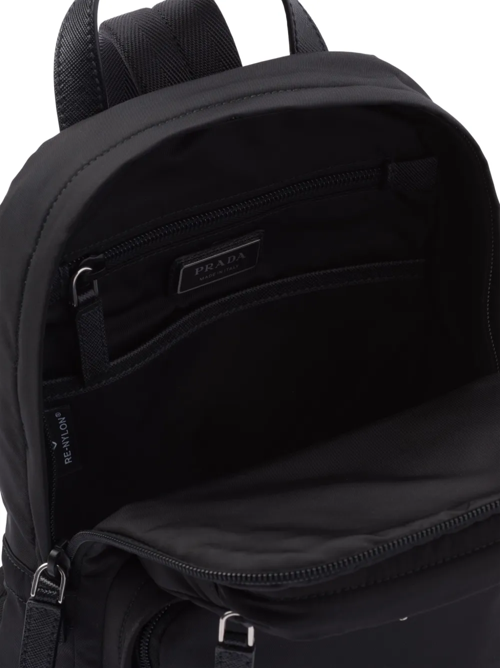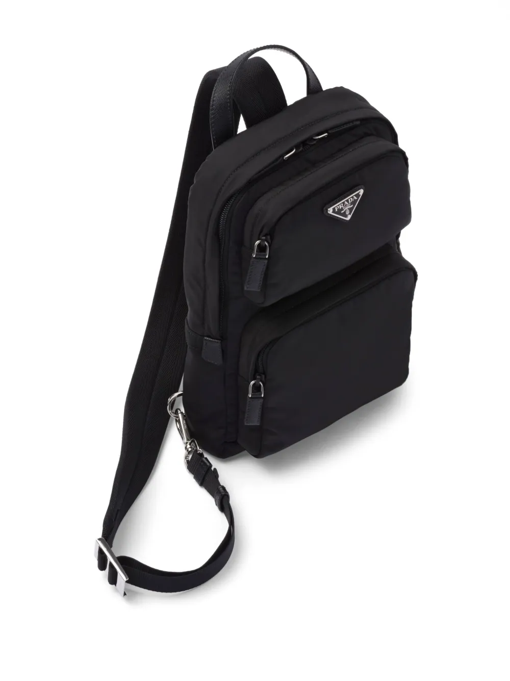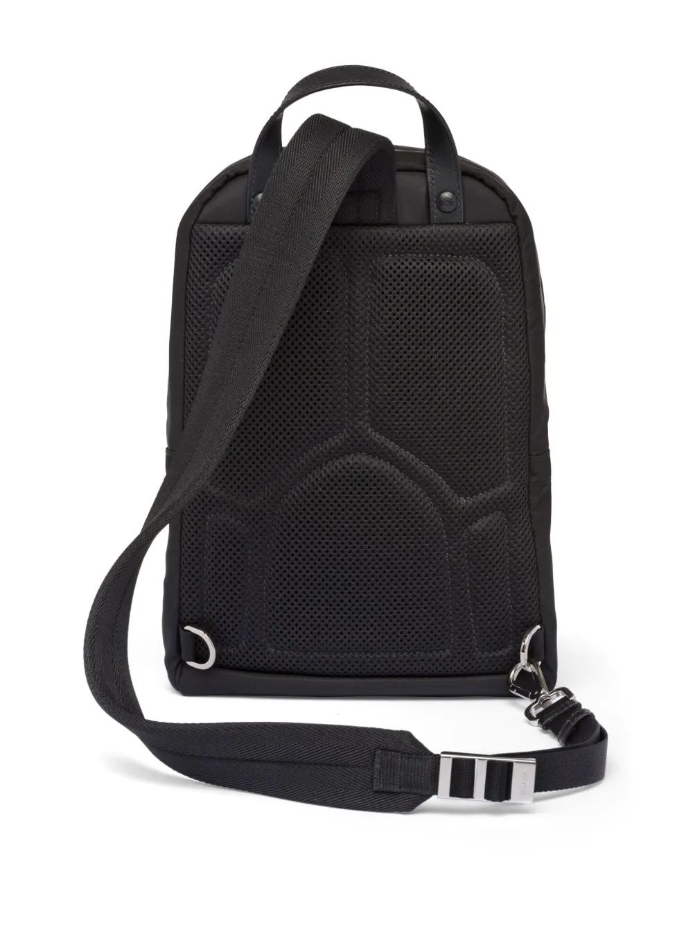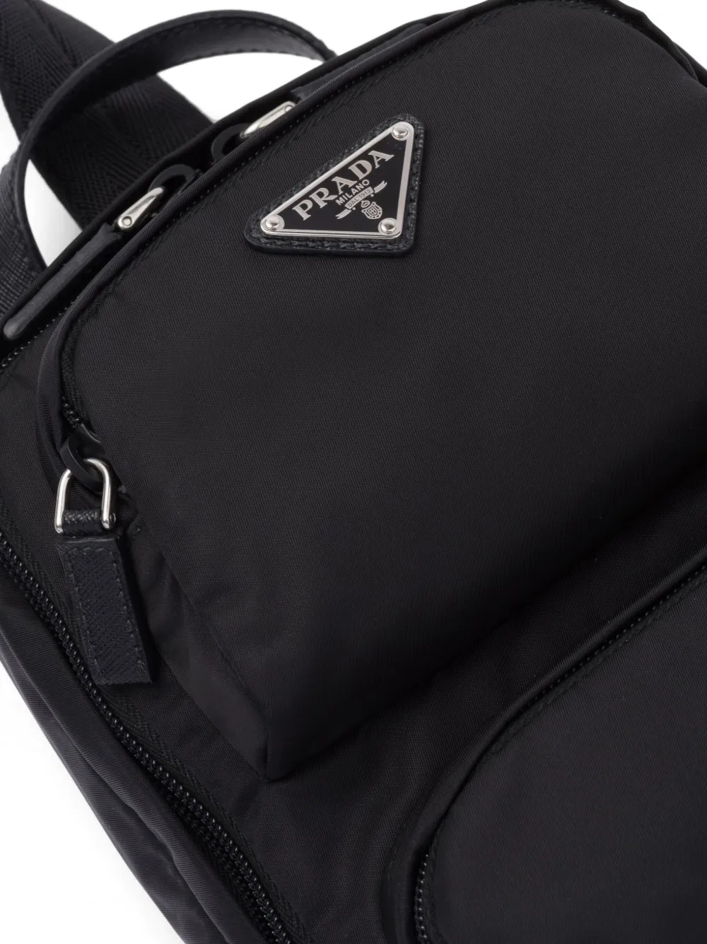 Черный, кожаная отделка, треугольный эмалированный логотип, серебристая фурнитура, двусторонняя молния, круглая верхняя ручка, регулируемый ремень на плечо, основное отделение, несколько карманов на молнии, нашивка с логотипом внутри, внутренний карман на молнии и внутренний прорезной карман.