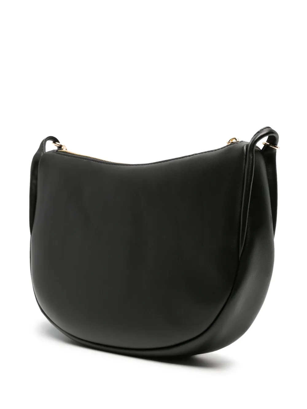 Черный, телячья кожа, нашивка с логотипом внутри, золотистая фурнитура, золотистый металлический логотип, застежка на молнии сверху, ремень на плечо, внутренний прорезной карман и основное отделение.
