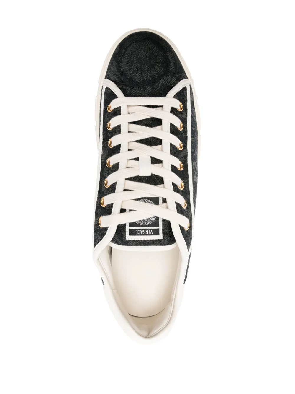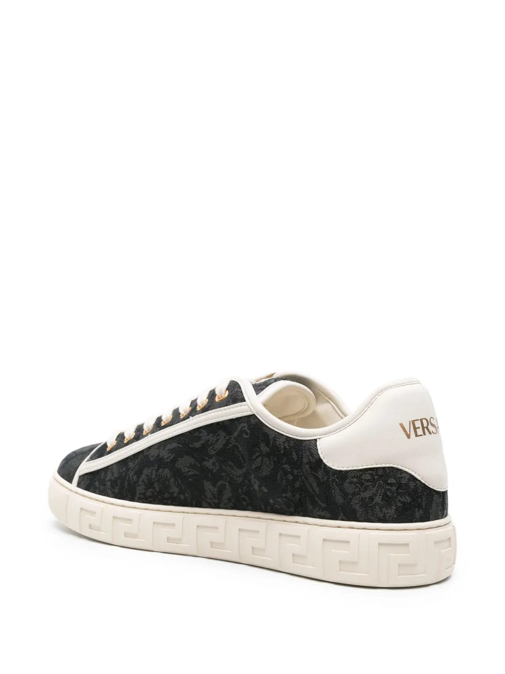 Черный, кремово-белый, парусина, знаковый принт Barocco, тисненый орнамент Greca, контрастная отделка, нашивка с логотипом на язычке, контрастный задник с логотипом, закругленный носок, шнуровка спереди, стелька с логотипом, подошва из вулканизированной резины, логотип на подошве и золотистая фурнитура. В комплект входит мешок-пыльник для хранения. В комплект входят оригинальные документы и коробка.