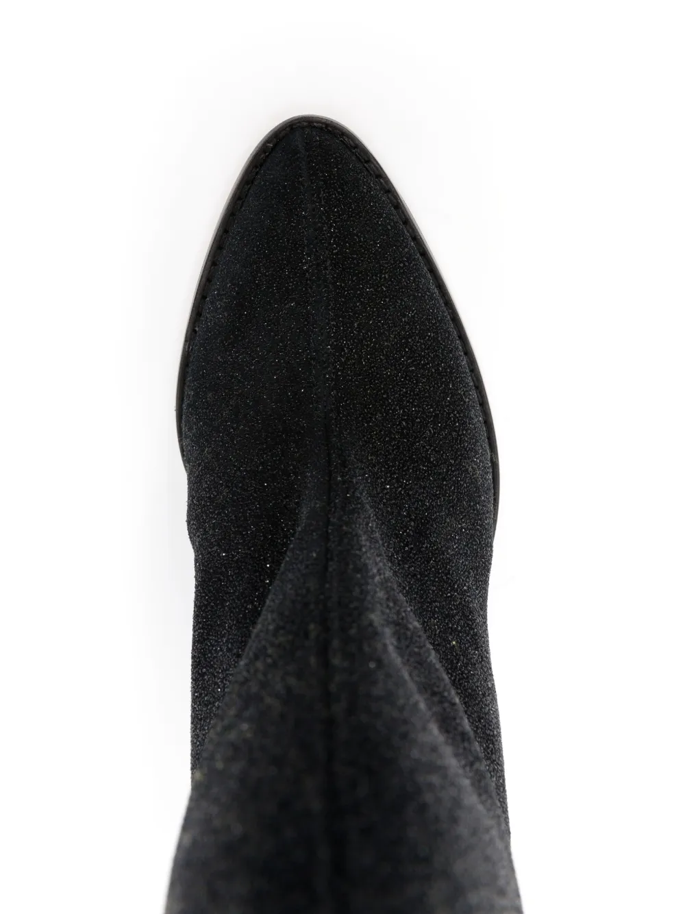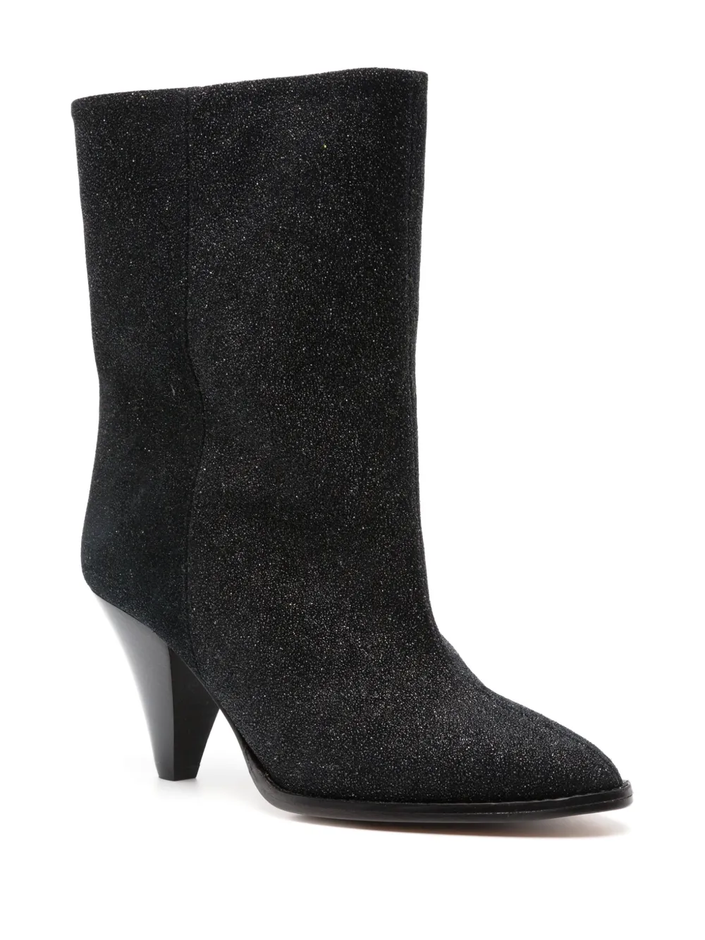 Черный, телячья кожа, замша, заостренный носок, высота по щиколотку, модель без застежки и высокий каблук в форме конуса.