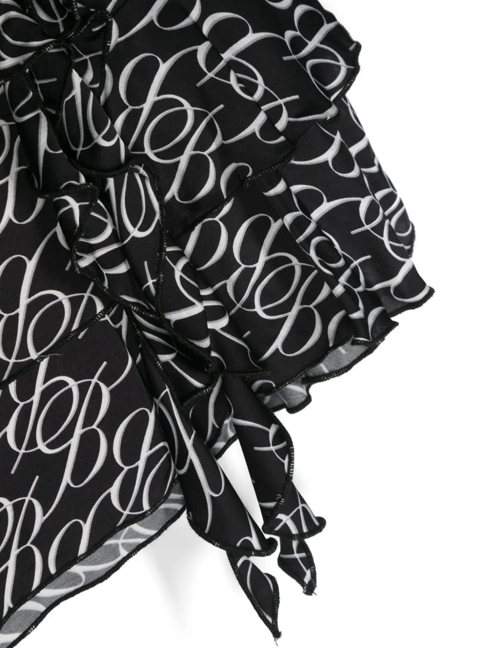 Черный/белый, сочетание двух оттенков, монограмма, ярусная юбка, вставки с оборками, драпировка, средняя посадка, потайная застежка сбоку, длина до бедер и асимметричный подол.
