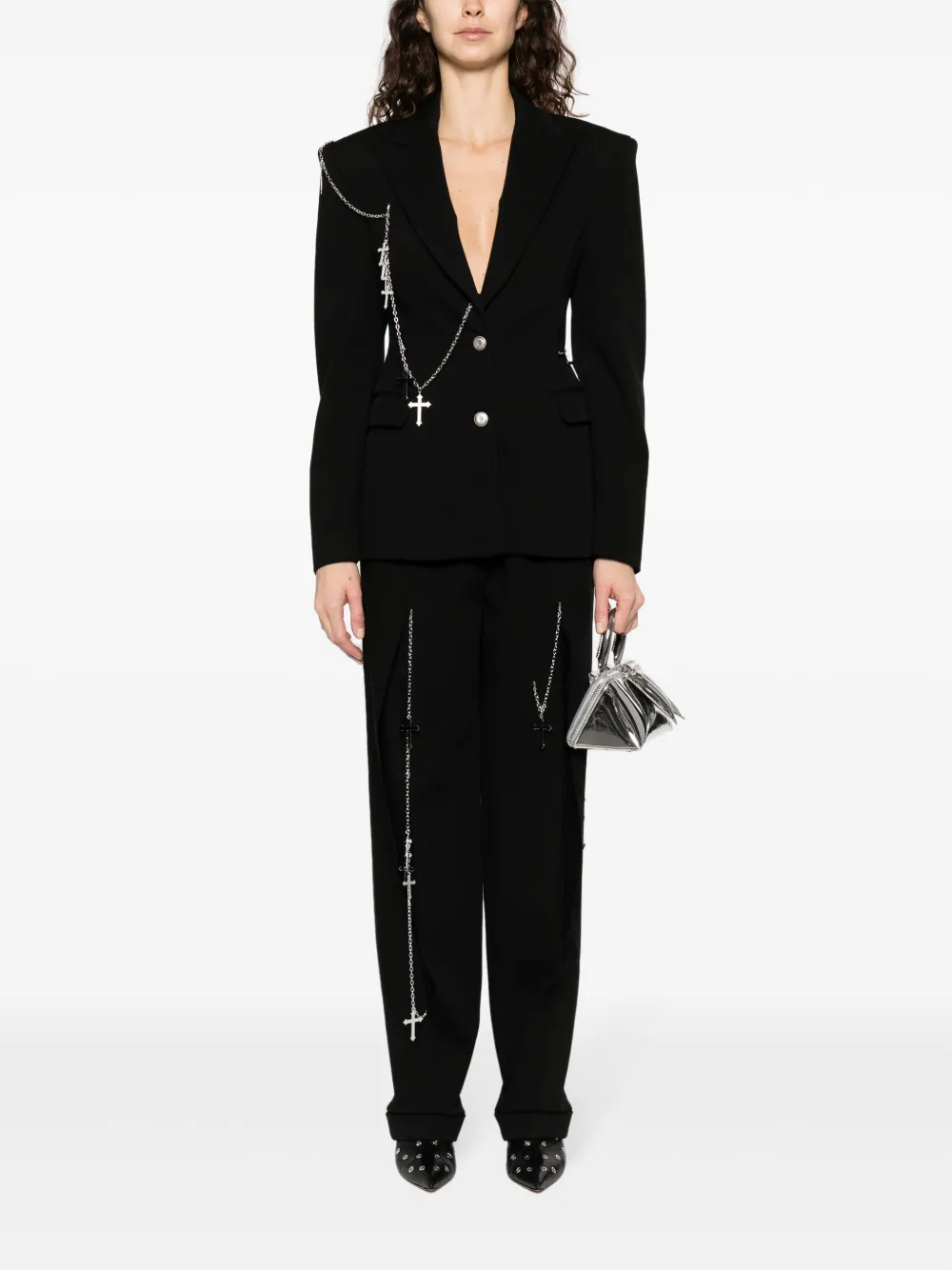 Смесь хлопка и кашемира, цепочка, подвеска-крест, заостренные лацканы, подплечники, манжеты на пуговицах, два передних кармана с клапанами, две боковые шлицы сзади и цельная подкладка.