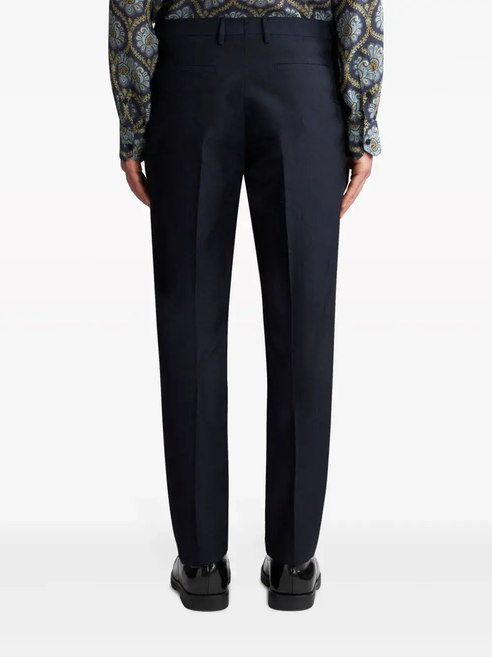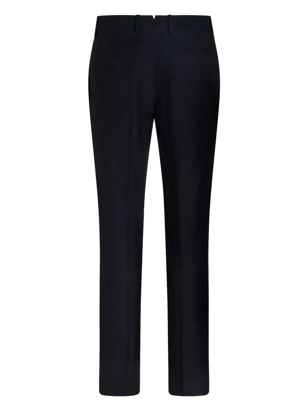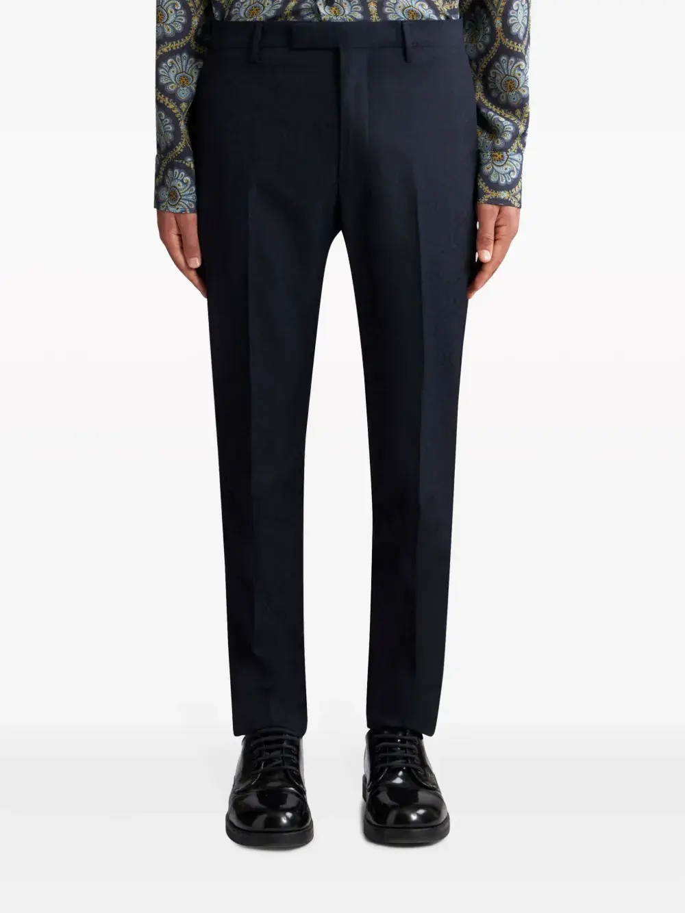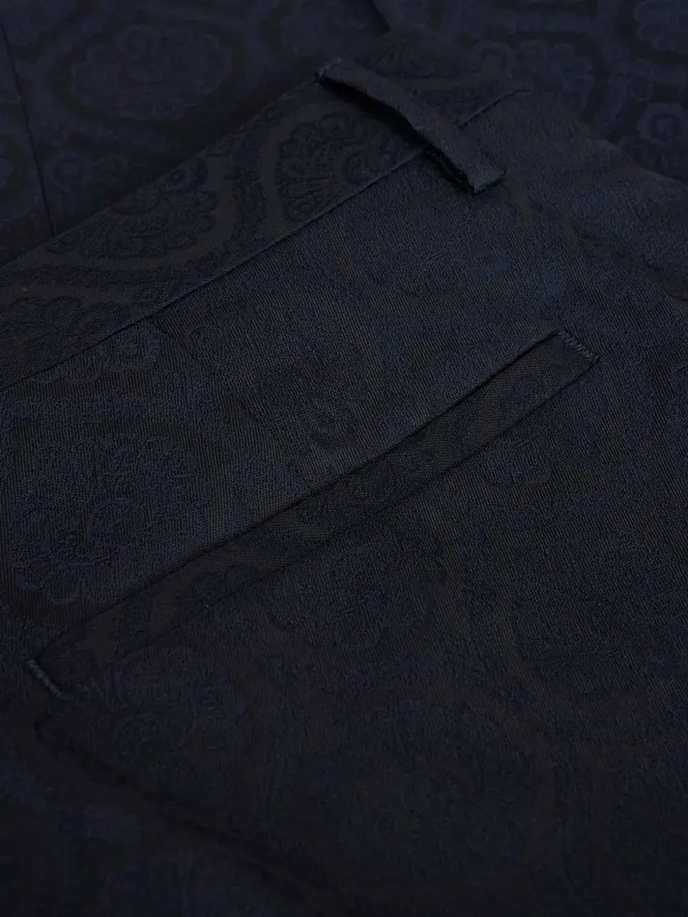 Темно-синий, смесь хлопка и шерсти, жаккард, стрелки, петли для ремня, смещенная застежка спереди, средняя посадка, зауженный крой, два вшитых кармана по бокам и два кармана с листочкой сзади.