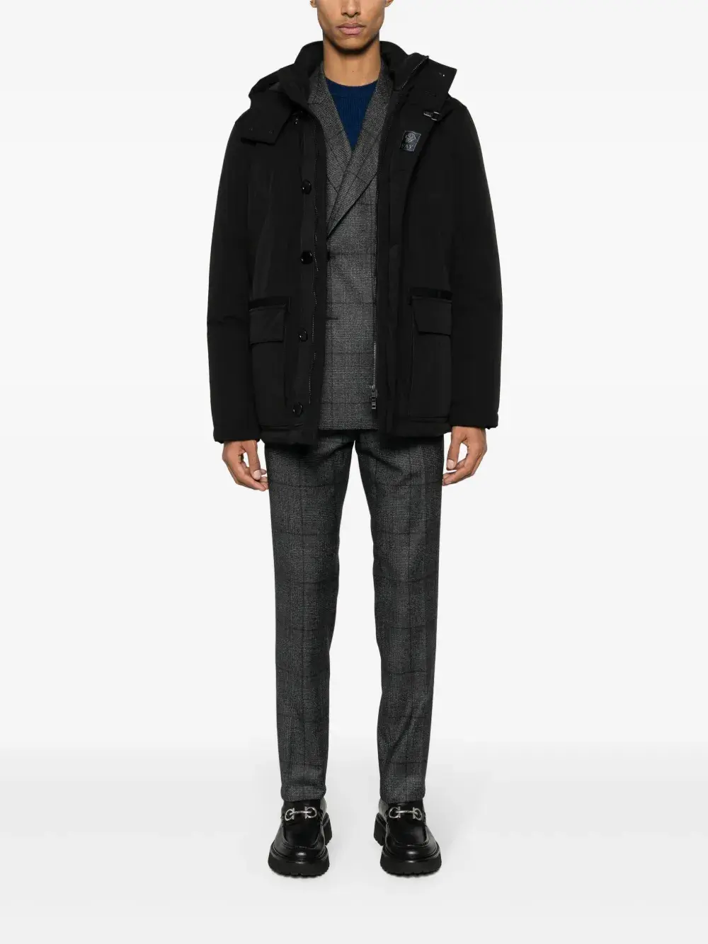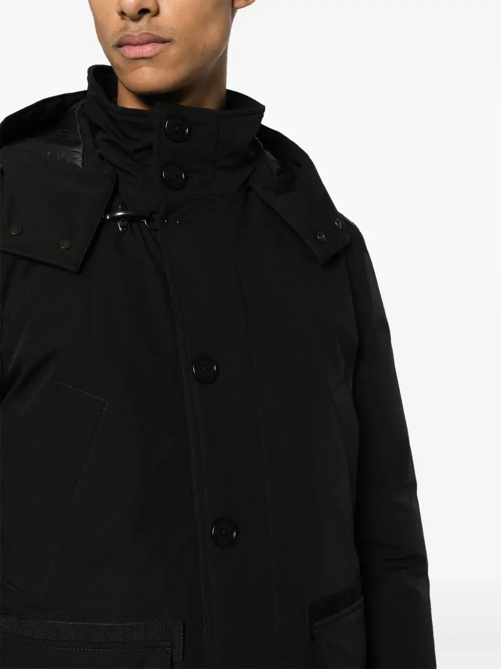 Черный, наполнитель из пуха и перьев, эластичный материал, объемный капюшон, воротник-стойка, застежка на пуговицах спереди, два нагрудных кармана с листочкой, передние карманы с клапаном, длинные рукава и прямой подол.