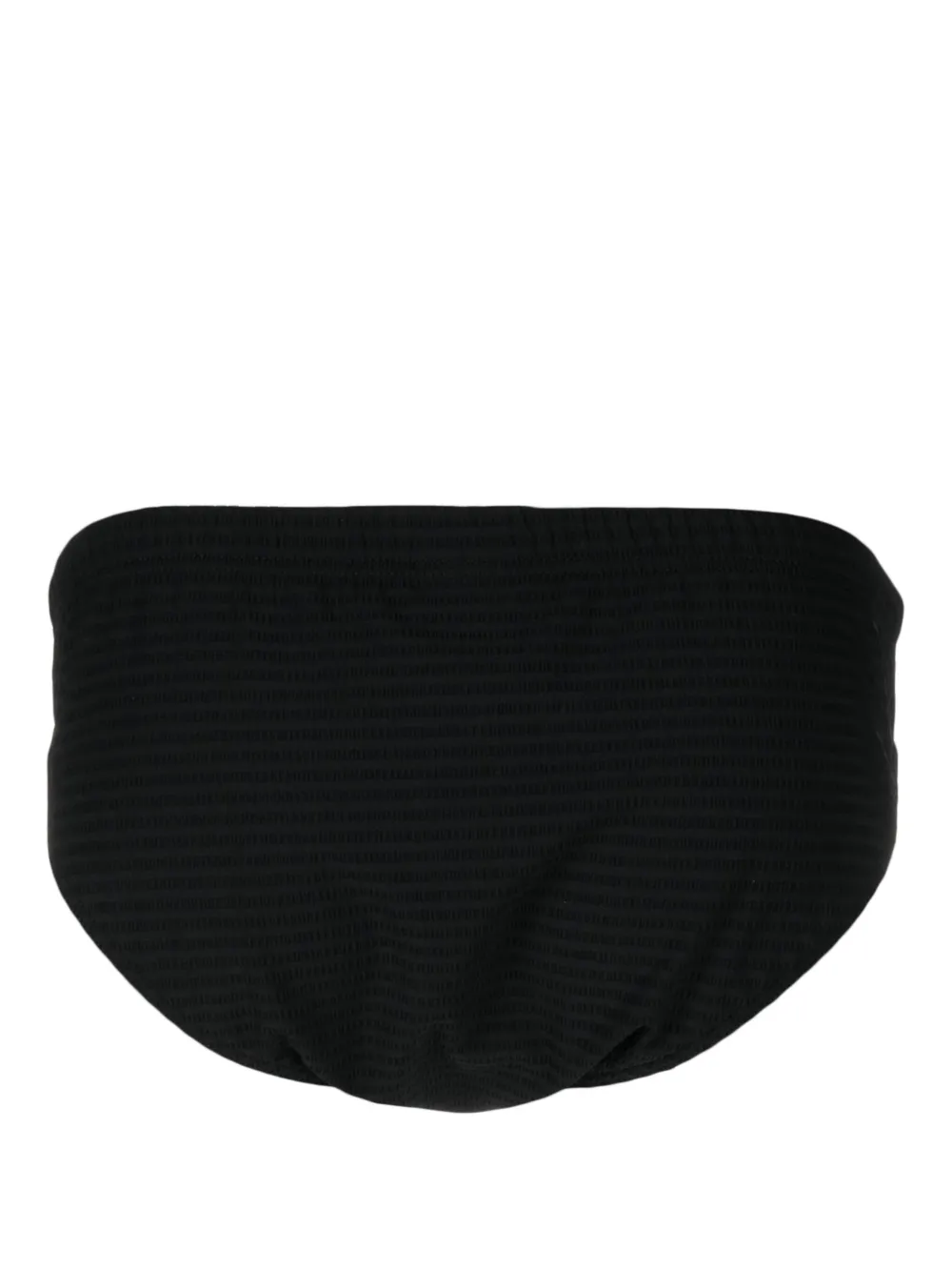 Черный, эластичный материал, детали в рубчик, золотистый металлический логотип и длина до бедер. Пожалуйста, примеряйте купальники и пляжные шорты только поверх собственного белья.