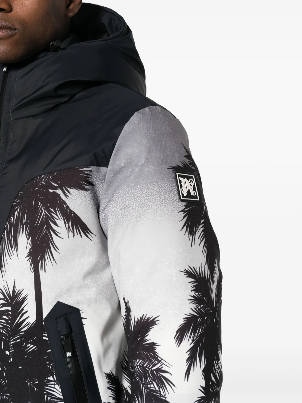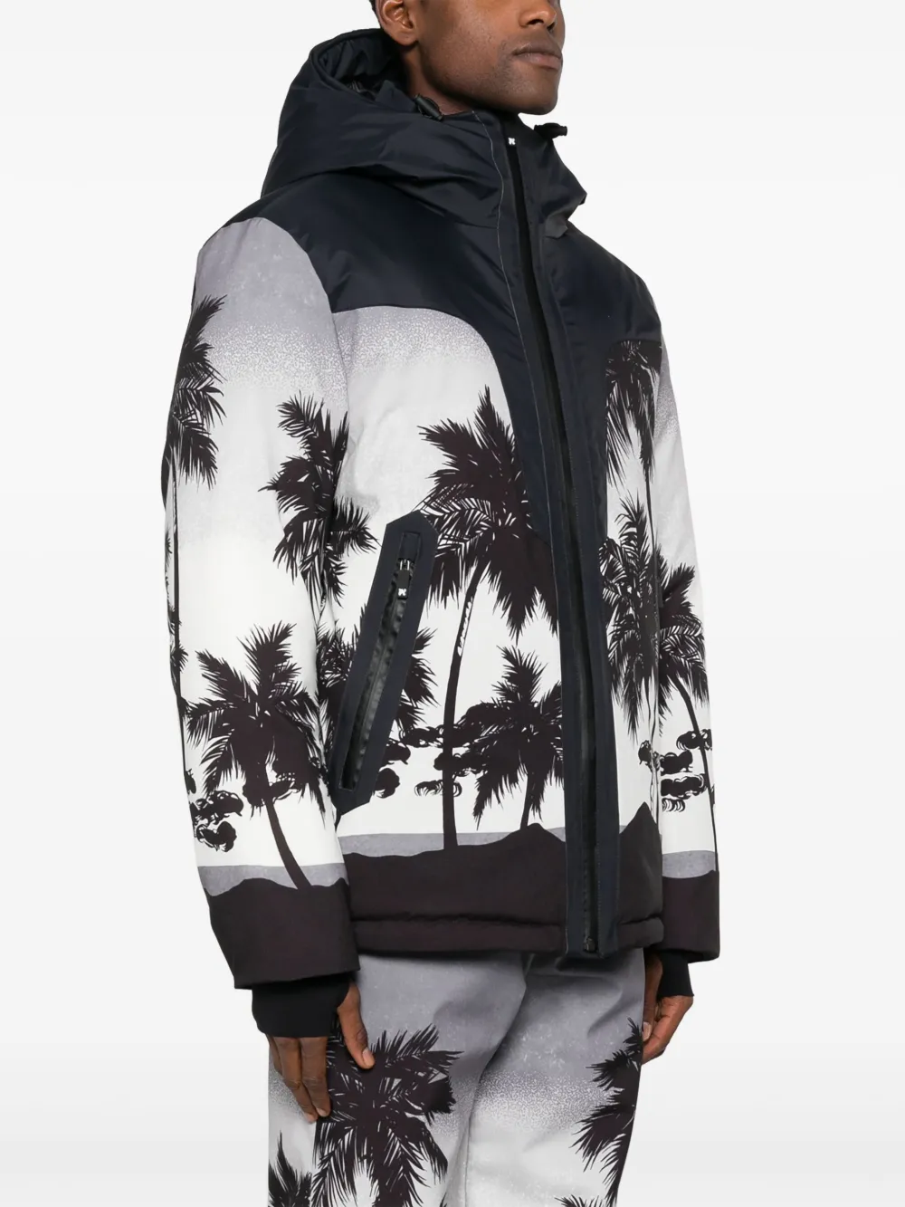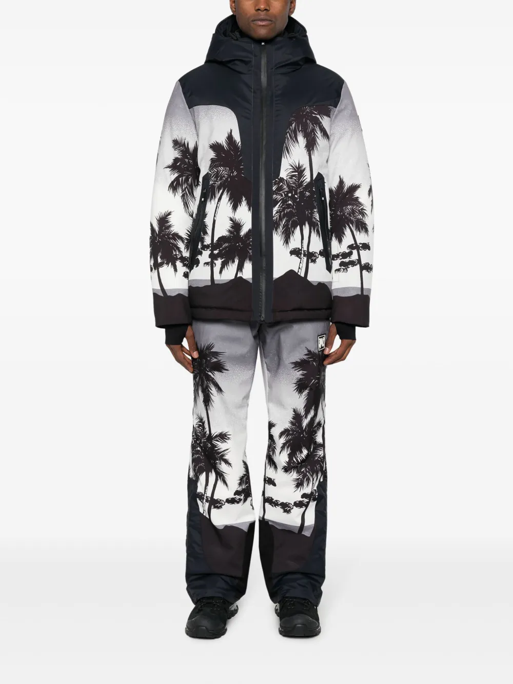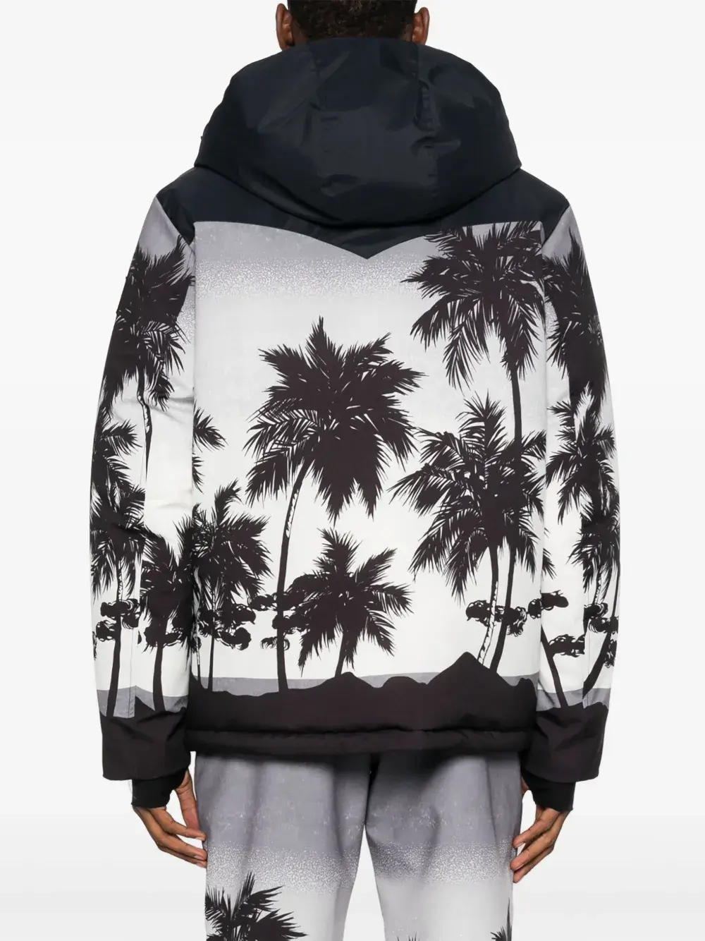 Светло-серый, черный, хлопок, принт с изображением пальм, дутый материал, классический капюшон, воротник-труба, длинные рукава и эластичные манжеты.
