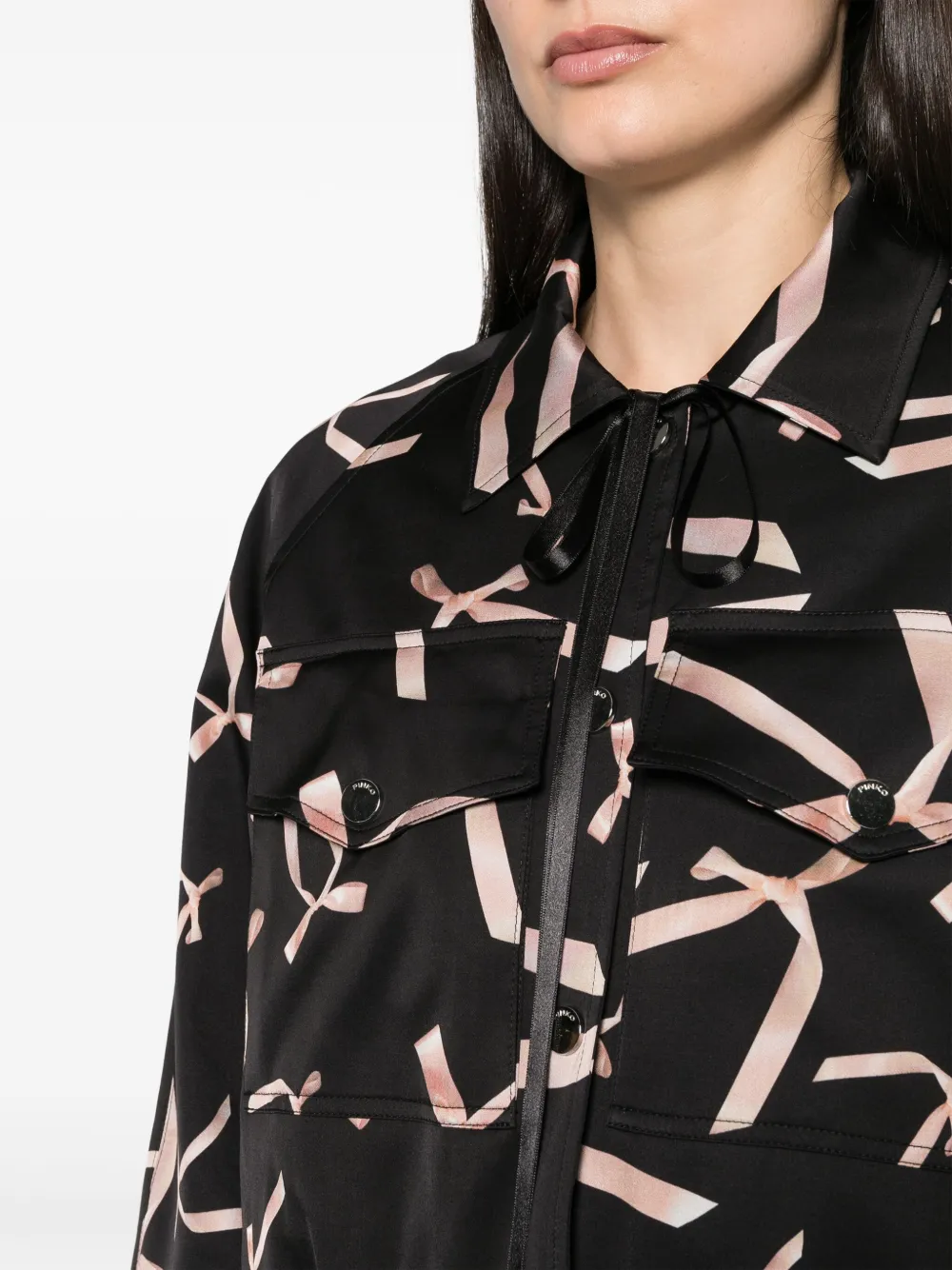 Подробнее о товаре: • черный, светло-розовый • ткань с сатиновым переплетением • принт с изображением бантов • косой воротник • ленточки на воротнике • длинные рукава • эластичный пояс и манжеты • два накладных кармана на груди • два прорезных кармана сбоку • внутренняя бирка с логотипом • цельная подкладка • прямой подол • застежка на кнопках спереди