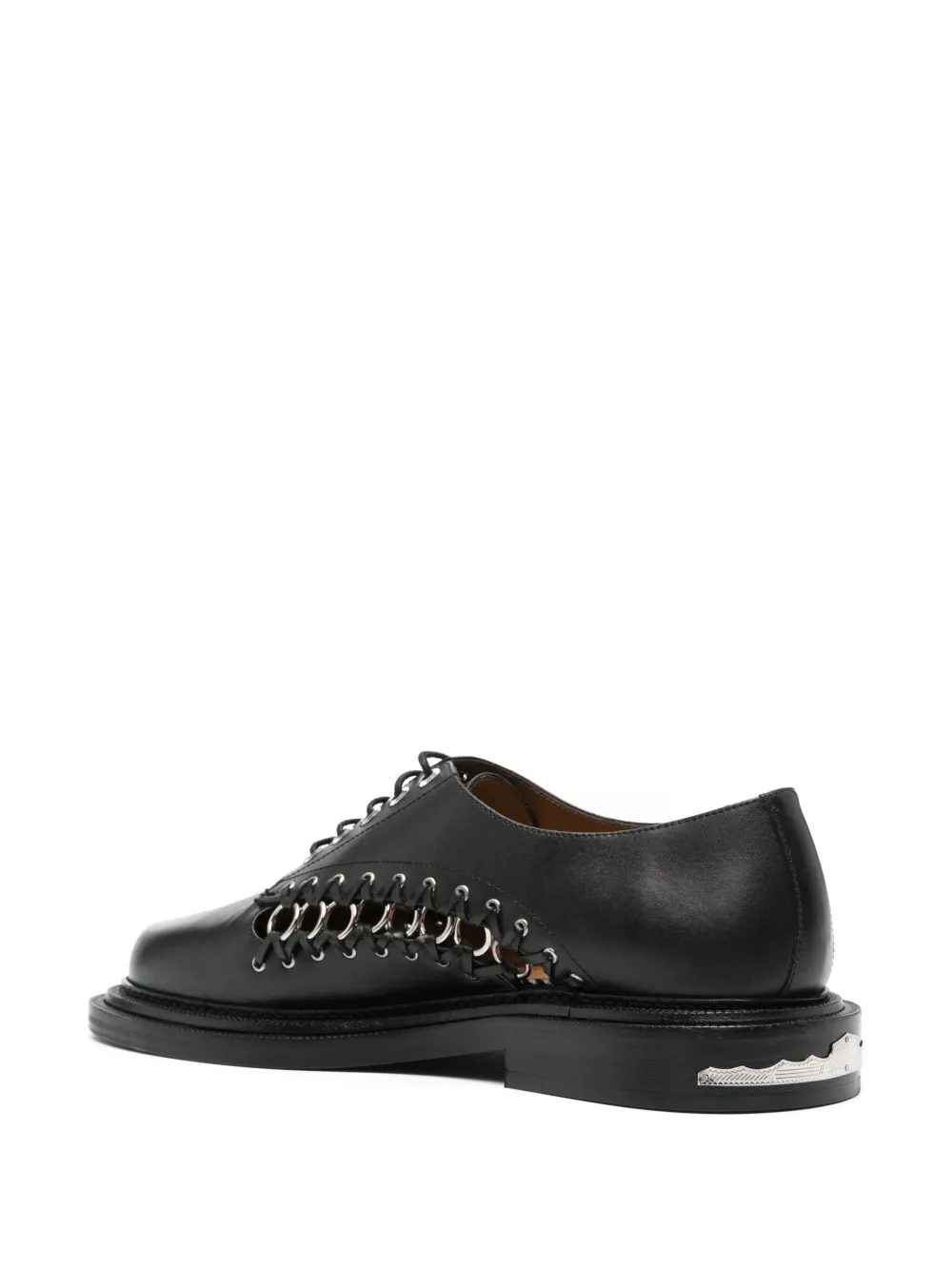 Подробнее о товаре: • черный • кожа • дизайн со вставками • тональная строчка • миндалевидный носок • декор в виде кольца • вырезные детали • отделка металлическими люверсами • закрытая союзка • кожаная стелька с логотипом • частичная подкладка • низкий блочный каблук 30 мм • сегментированная подошва • серебристая фурнитура • шнуровка спереди • В комплект входит мешок-пыльник для хранения.