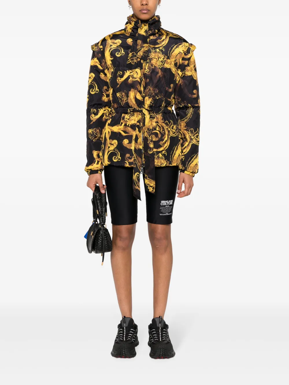 Подробнее о товаре: • черный/золотистый • на пуху • водонепроницаемый материал • дутый материал • стеганная модель • принт в стиле барокко • сплошной принт с логотипом • пуллер с логотипом • воротник-стойка • заниженная линия плеч • длинные рукава • эластичные манжеты • два кармана на молнии по бокам • ремешок на воротнике • двусторонняя молния спереди • застежка на кнопке • прямой подол • цельная подкладка