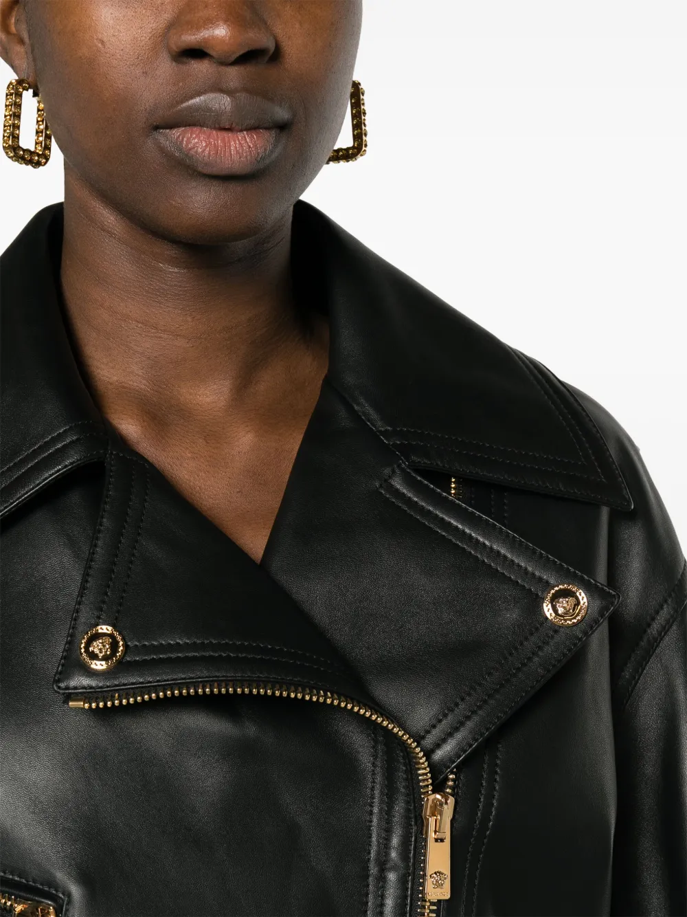 Подробнее о товаре: • черный • овечья кожа/телячья кожа • узор Medusa Head • золотистые заклепки • пуллеры с логотипом • отложный воротник • смещенная застежка на молнии спереди • заниженная линия плеч • длинные рукава • молнии на манжетах • несколько карманов на молнии • пояс с пряжкой • петли для ремня • подкладка с принтом Barocco • внутренняя вставка с логотипом • внутренние прорезные карманы • прямой подол