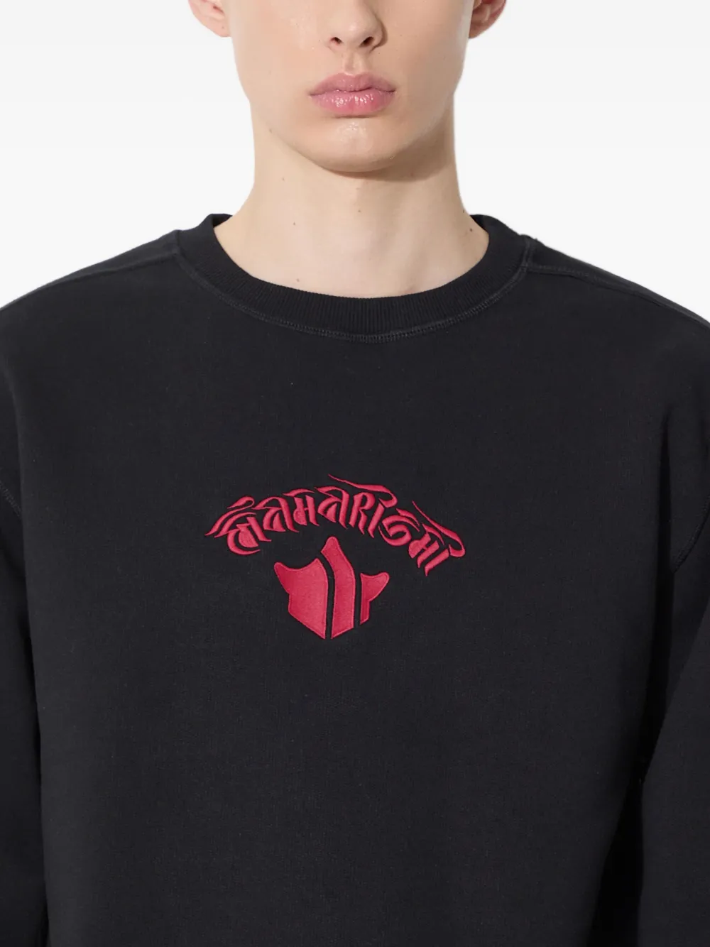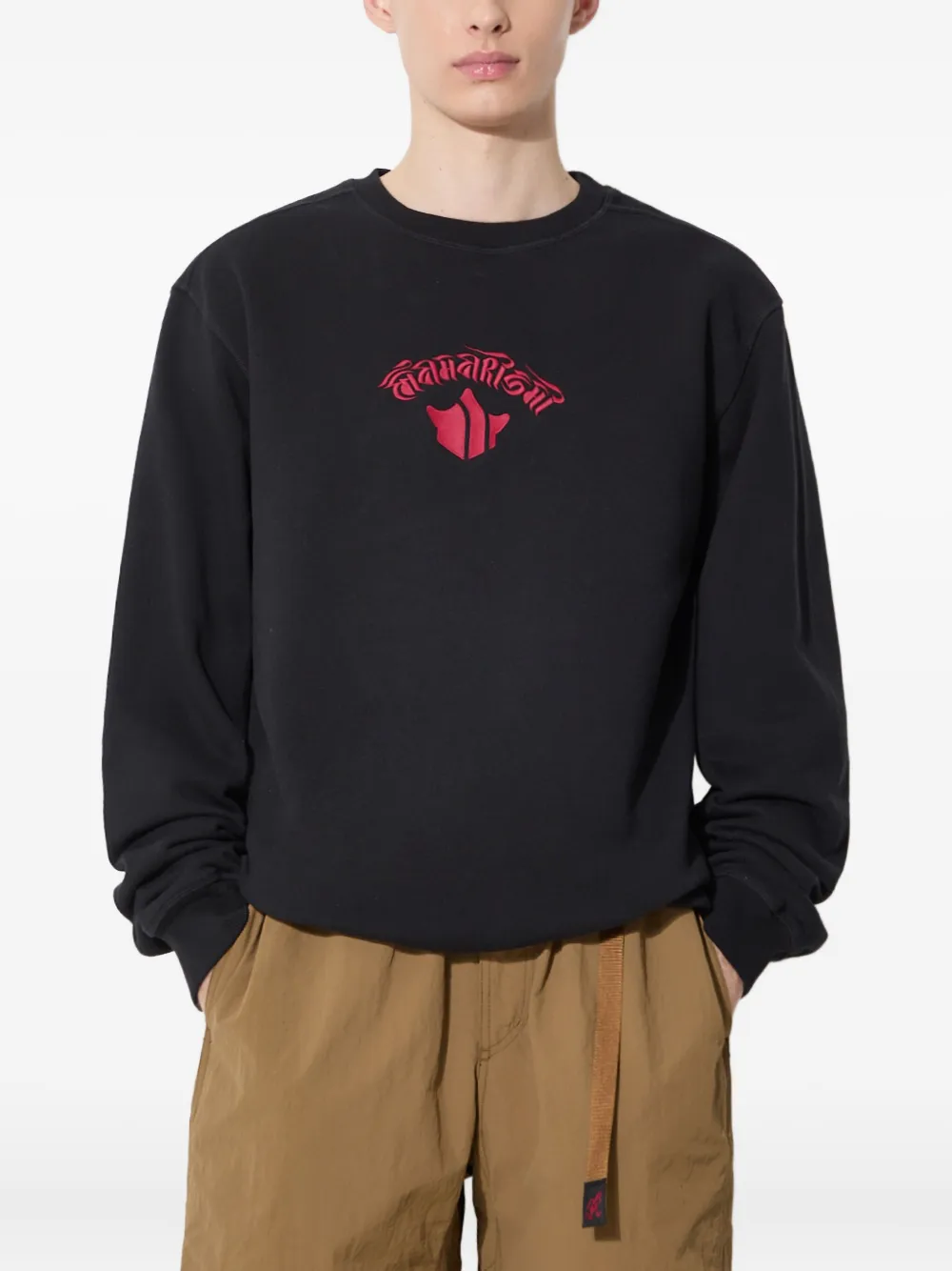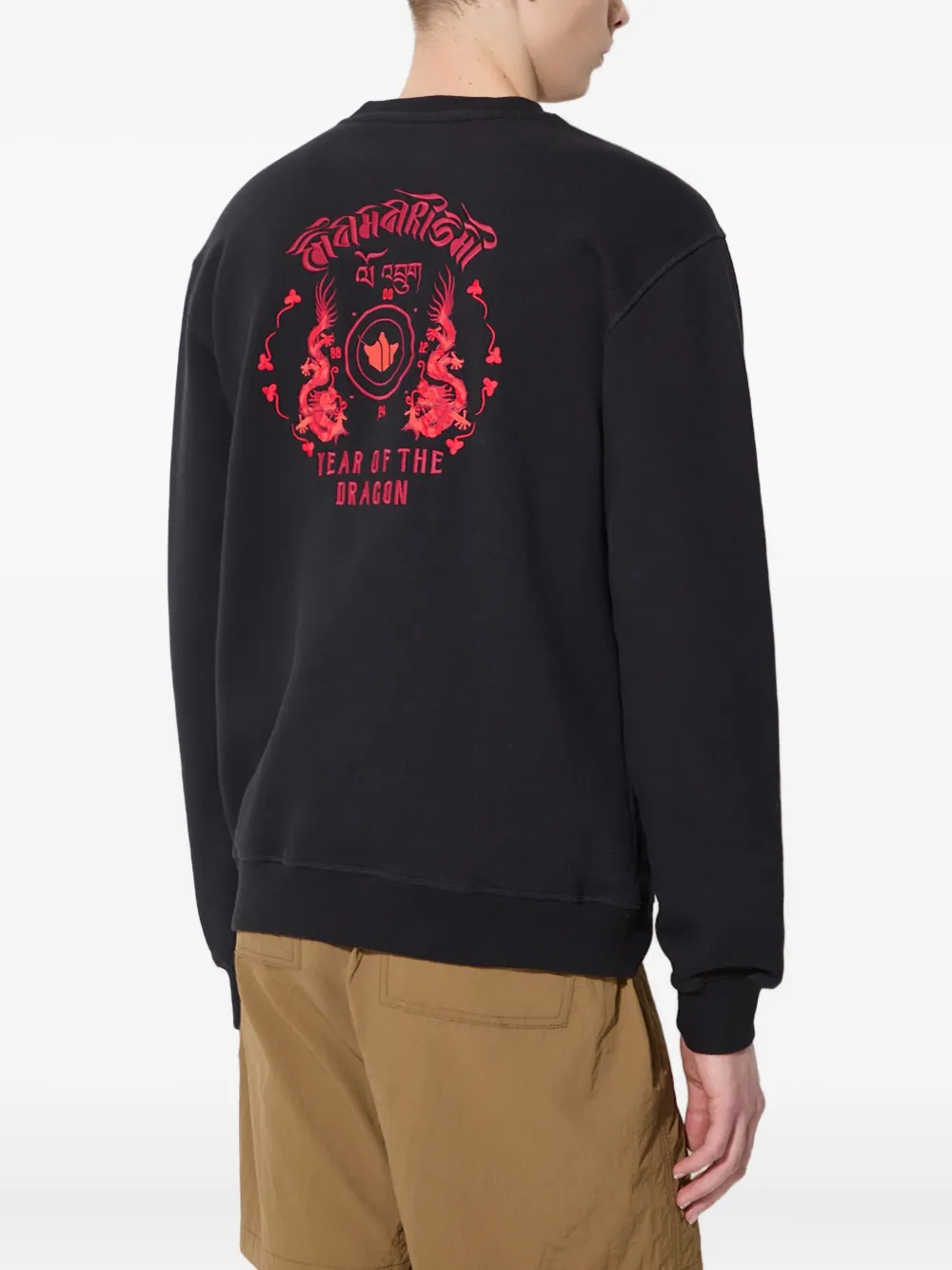 Черный вышитый дракон, вышитая надпись, круглый вырез горловины, длинные рукава