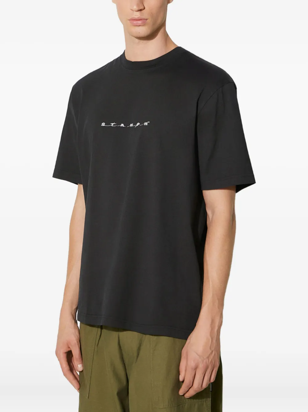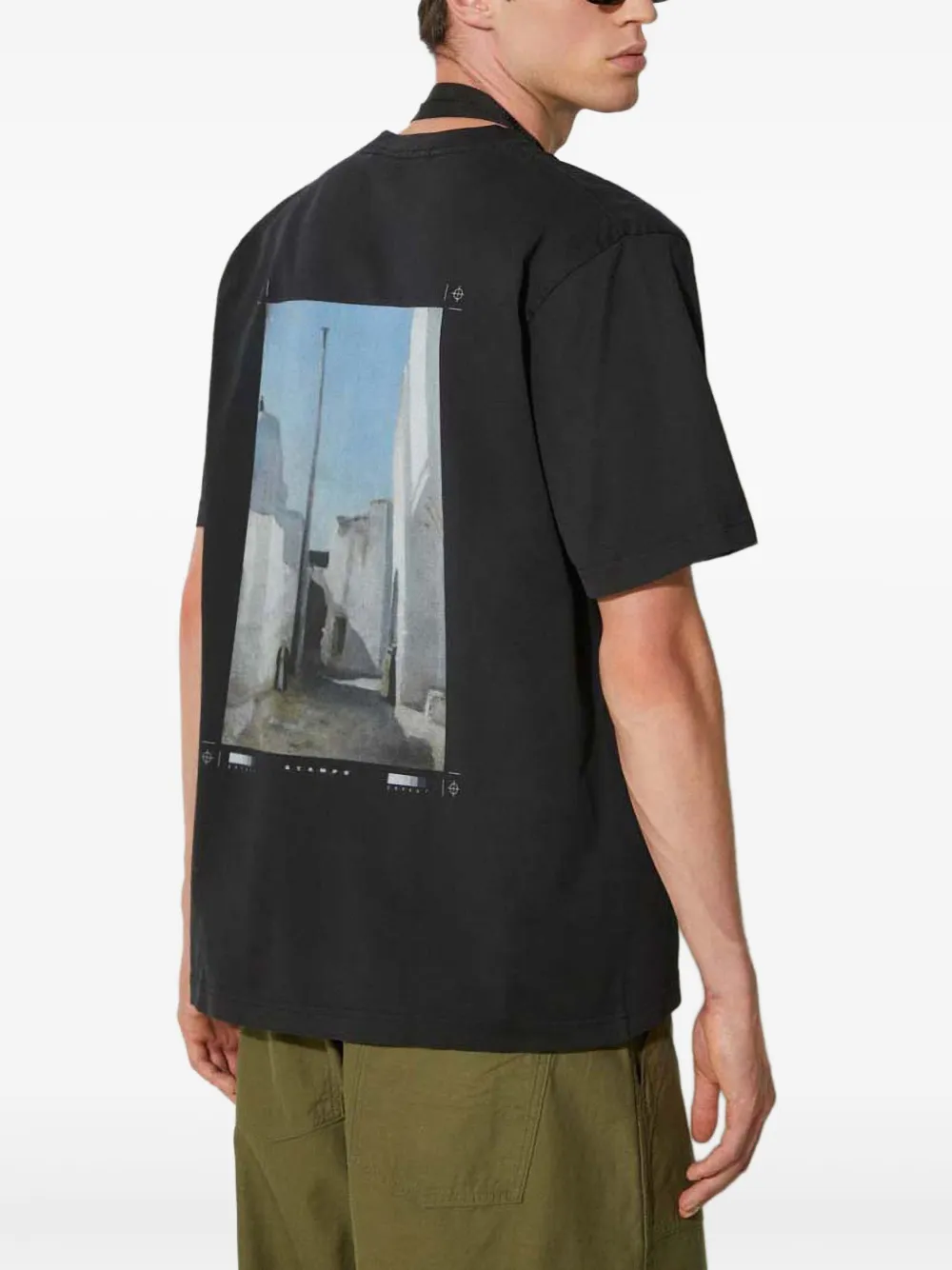Черная графическая вставка на спине, круглый вырез горловины, короткие рукава