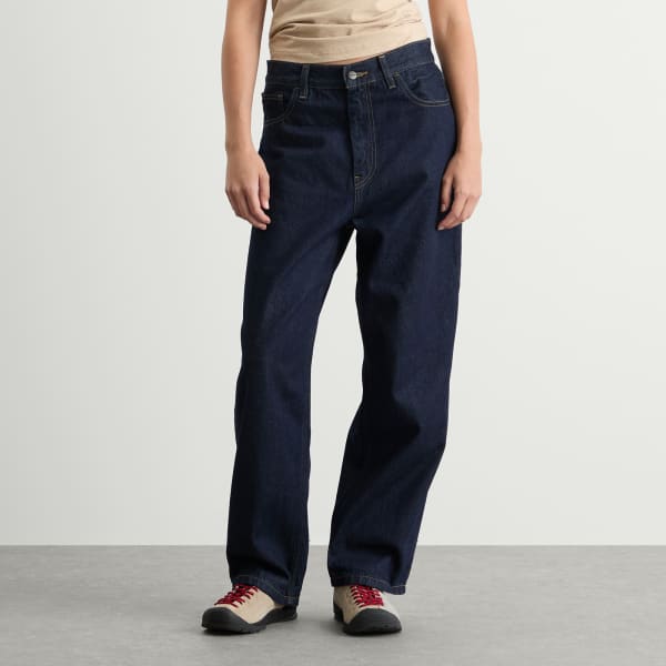 Эти джинсы Carhartt WIP, выполненные в винтажном стиле рабочей одежды, сшиты из стираного хлопкового денима. Свободный прямой крой с низкой талией, фирменная тканая квадратная этикетка сзади завершает образ.